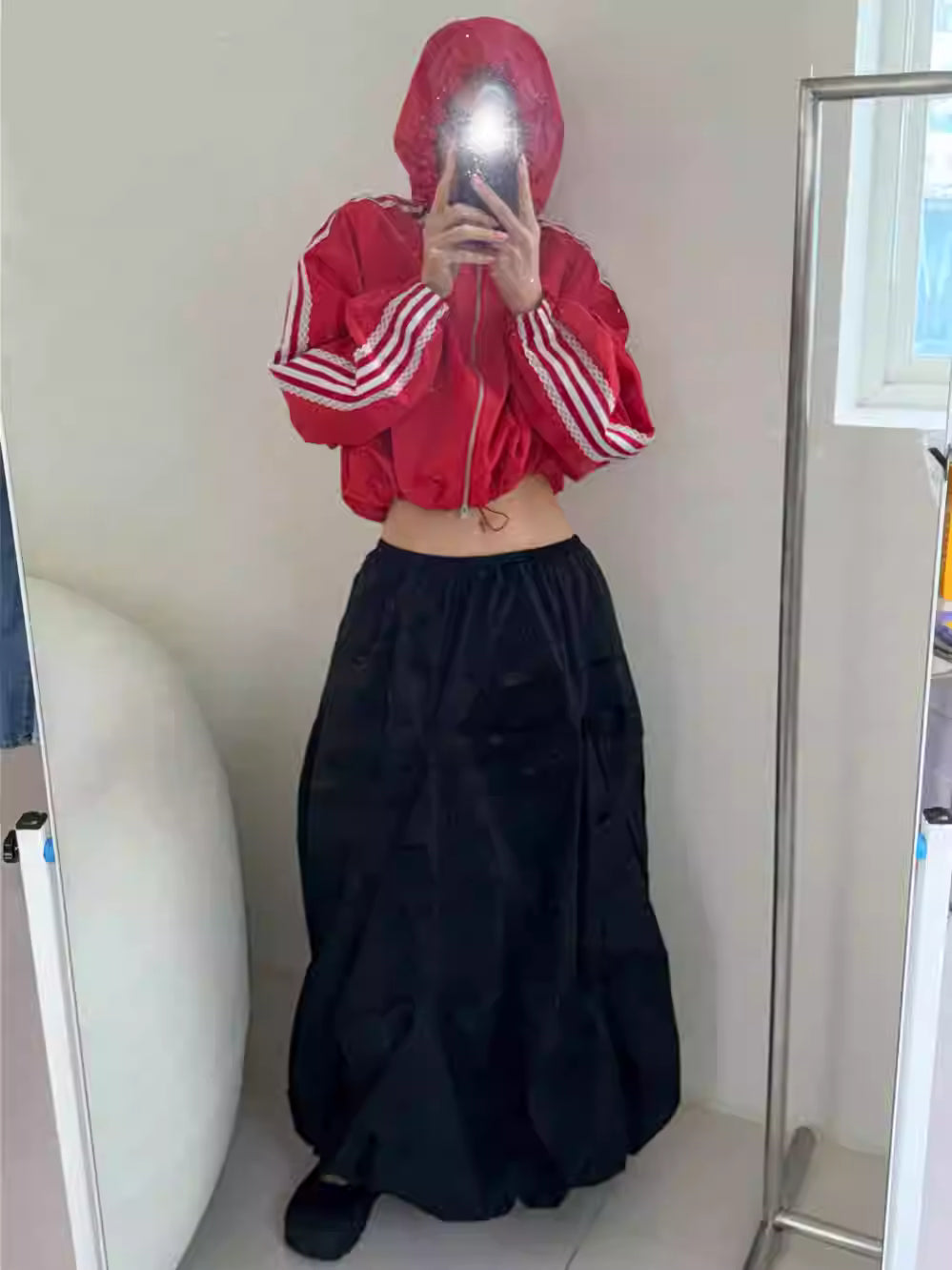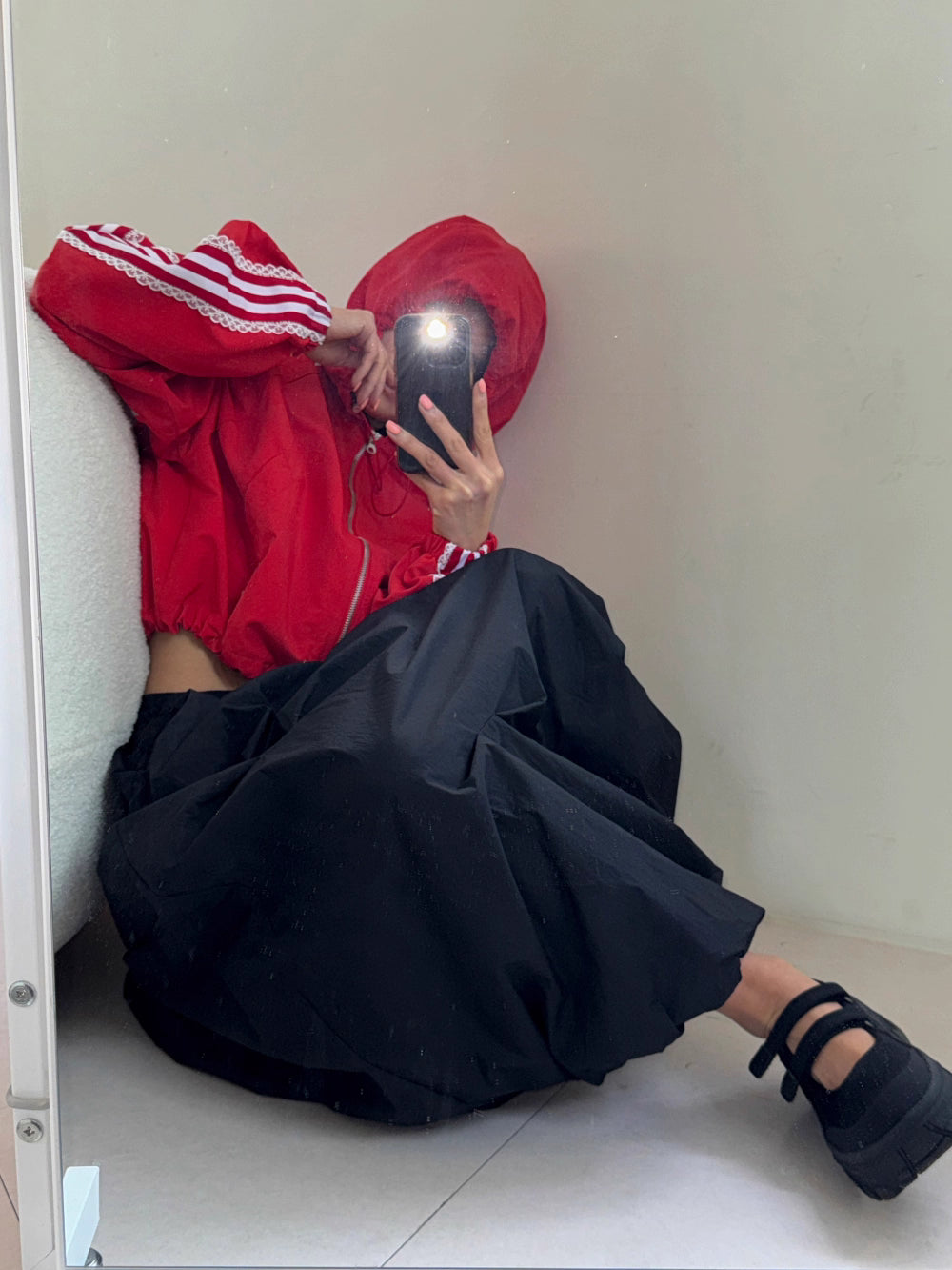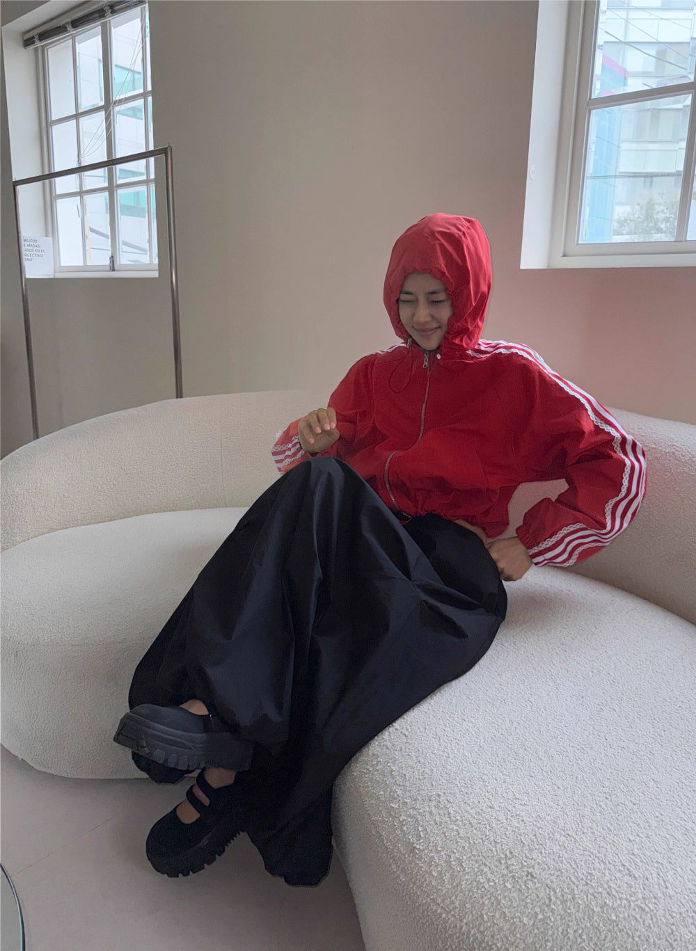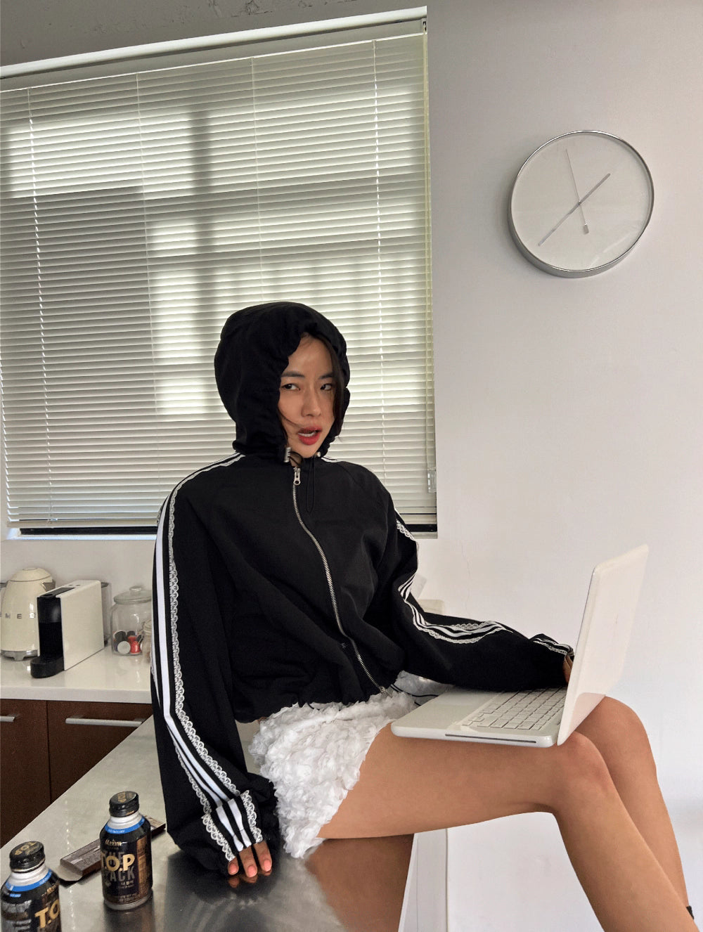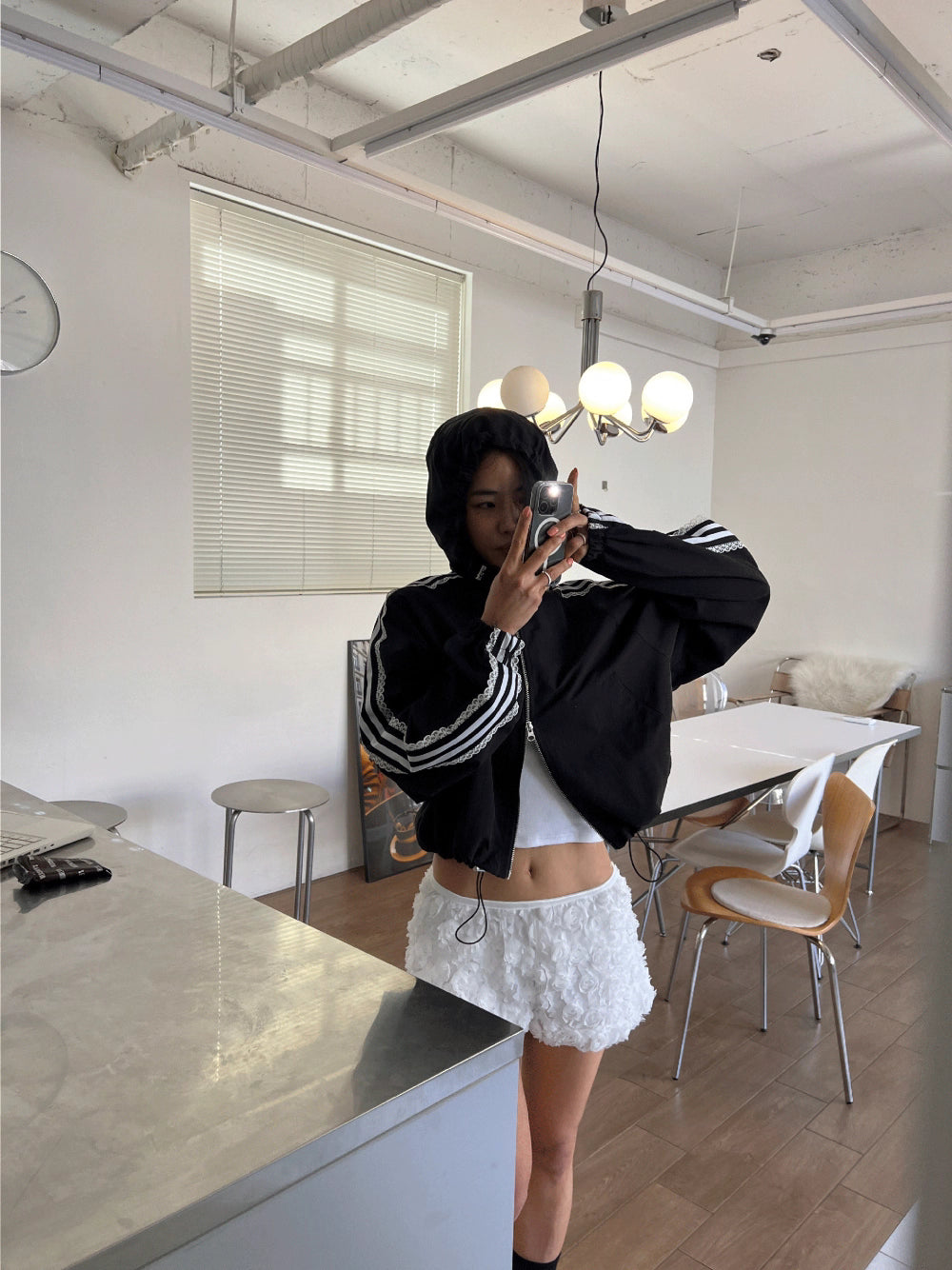 レース ライン ナイロンジャケット韓国 スポーティ ファッション フォード ショート丈 ドローコード 調整 ジャケット