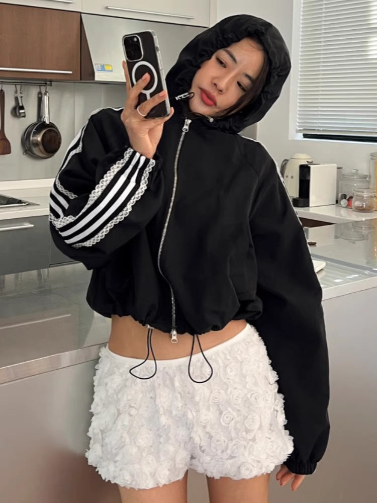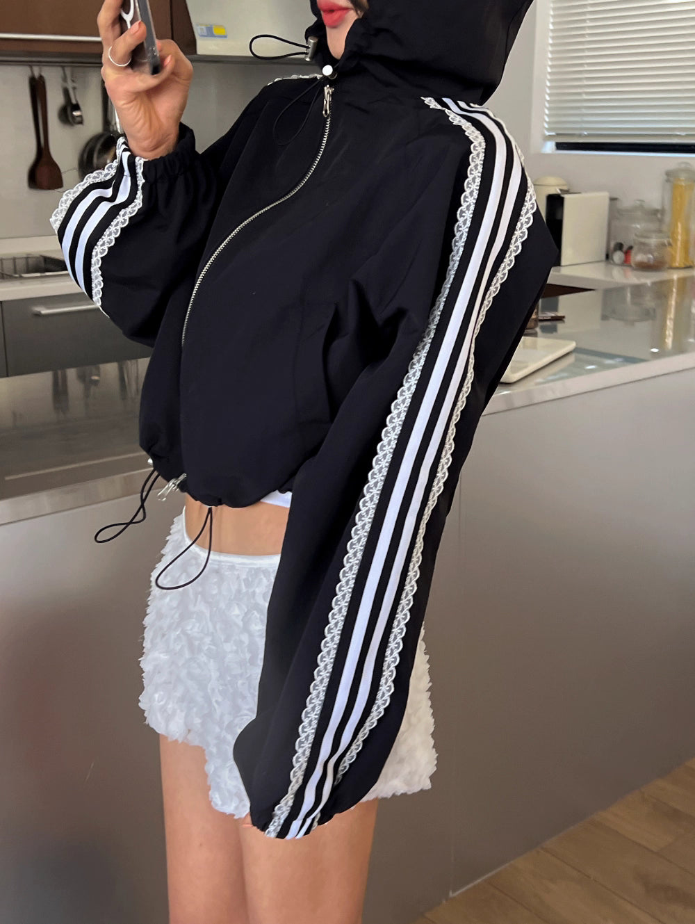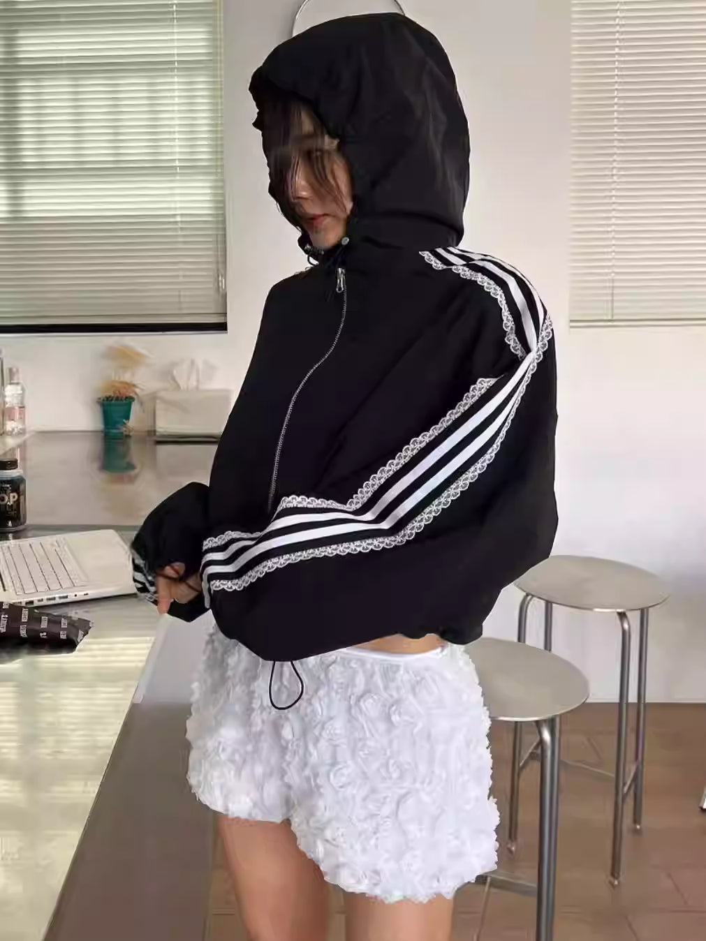 レディース 2025年春新作 レーストリム スポーティ フード付き ショートジャケット プチスタイル ファッショナブル 万能トップス