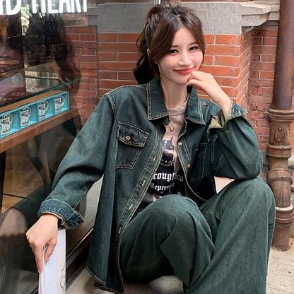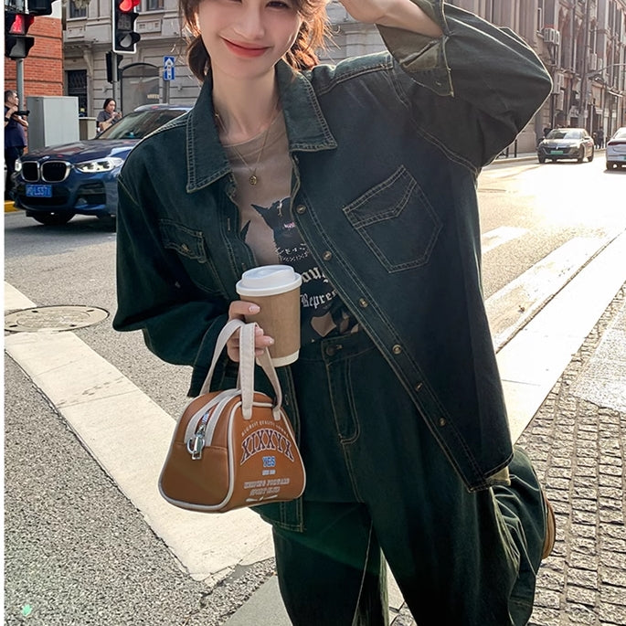 デニムセットアップ レディース 韓国 ファッション ダンガリーシャツ カバーシャツ ワイドパンツ デニムパンツ デニムシャツ メンズライク ベーシック ブルーデニム 春 コーデ