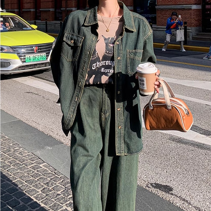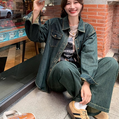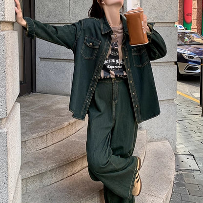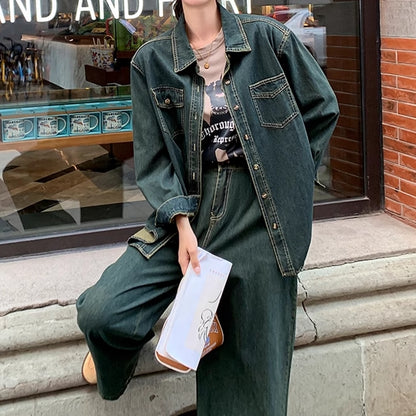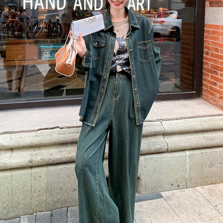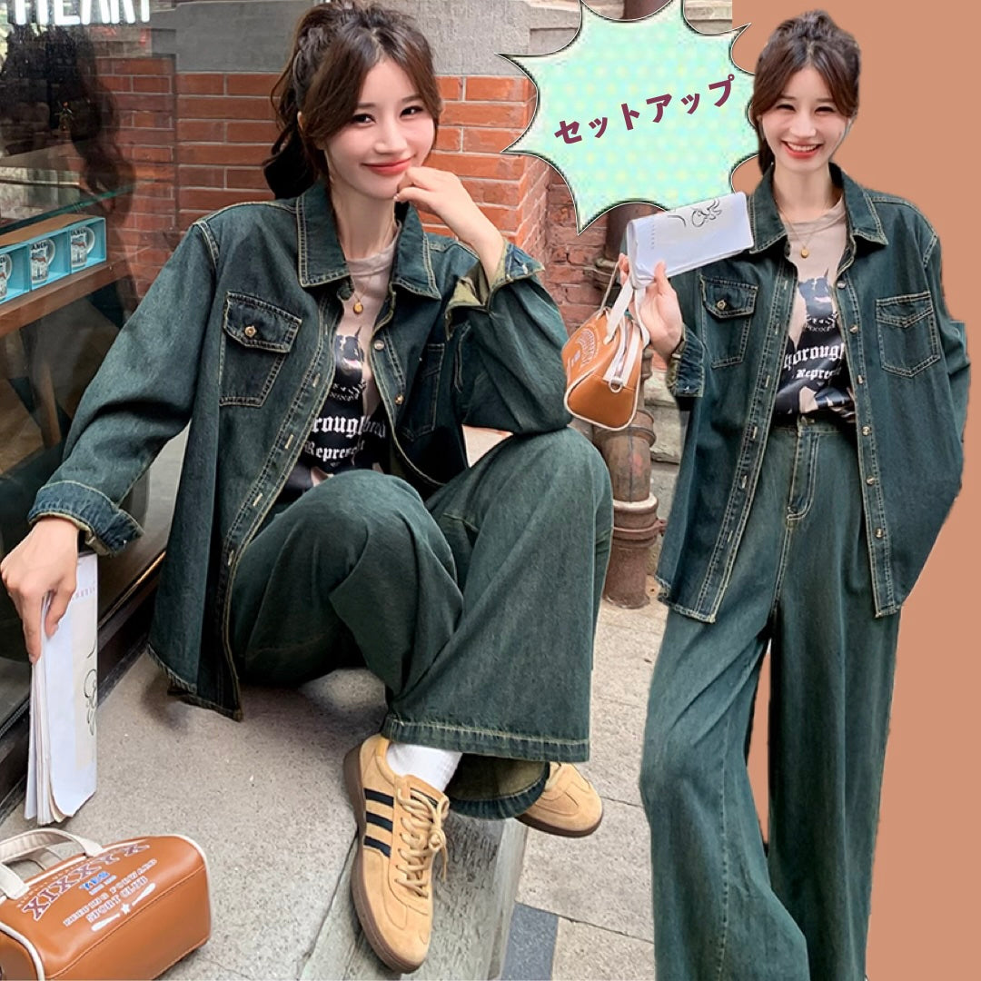 デニムセットアップ レディース 韓国 ファッション デニム ダンガリーシャツ ワイドパンツ 上下セット 春コーデ デニムオンデニム