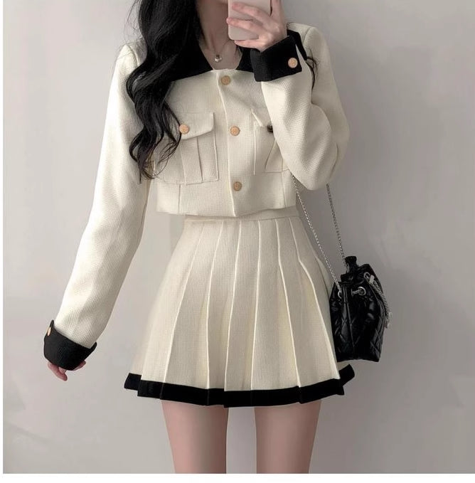 セットアップ レディース 韓国 ファッション ショートジャケット カフスボタン プリーツスカート ショートトップス おしゃれ ジャケット スカート