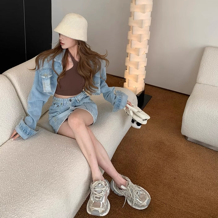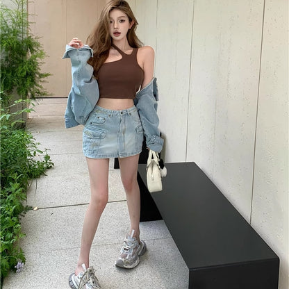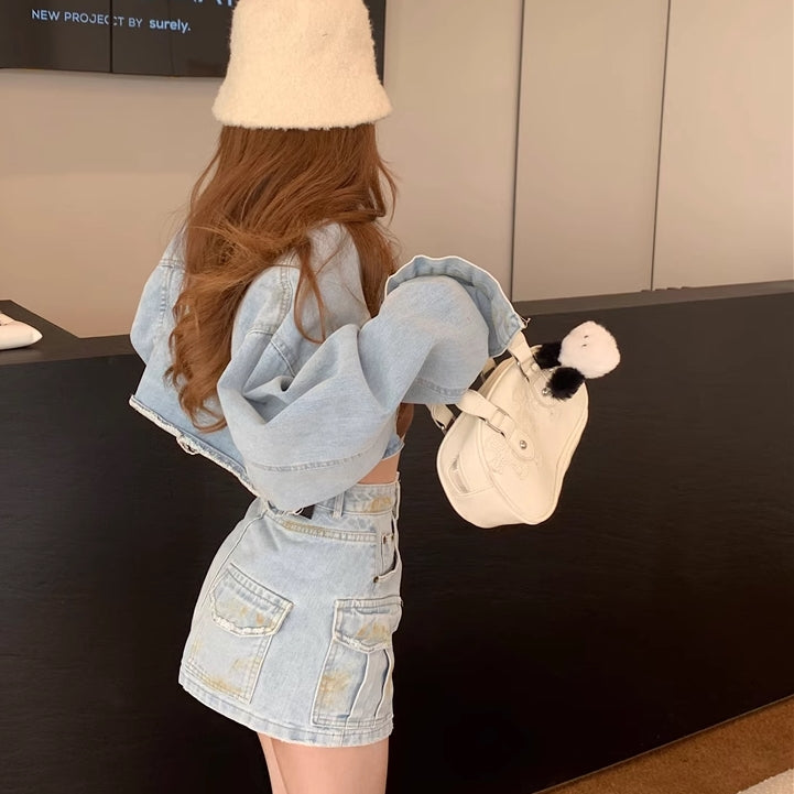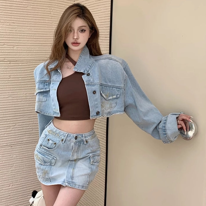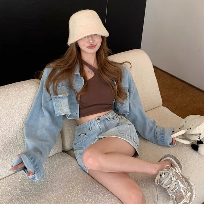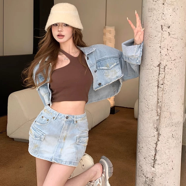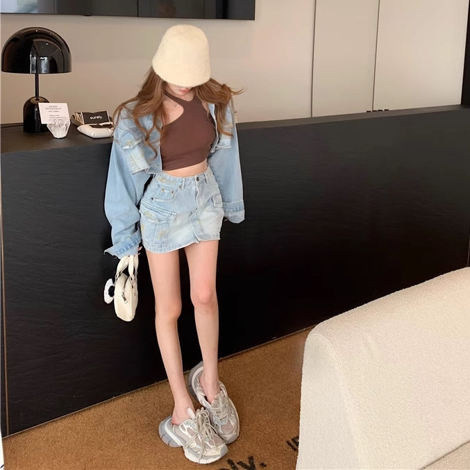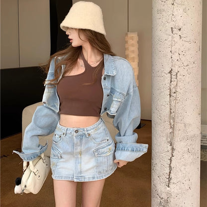 デニム セットアップ レディース 韓国 ファッション クロップド デニムジャケット カーゴ ミニスカート 上下セット 春夏デニム