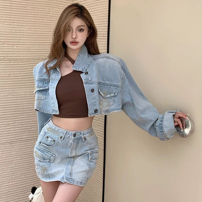 セットアップデニム レディース 韓国 ファッション ロング袖 デニムジャケット ミニスカート デニム デニムオンデニム