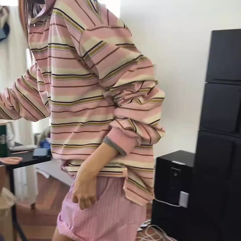 ポロシャツ 長そで レディース 韓国 ファッション マルチボーダー ボタン襟 ラガーシャツ カットソー 長T 秋トップス ロゴ ワンポイント 柄シャツ