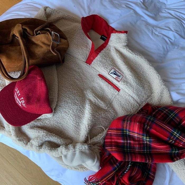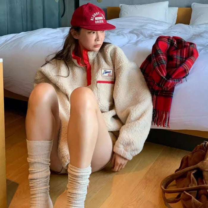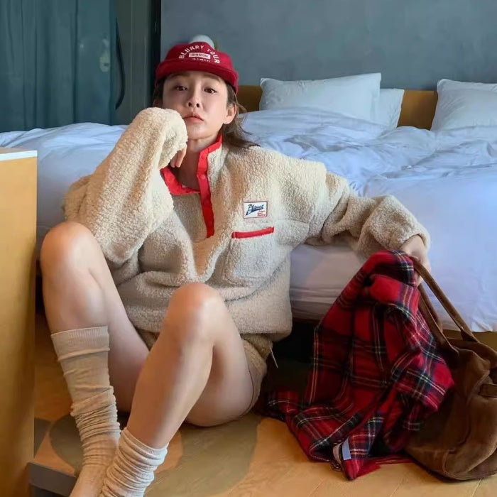 ボアトレーナー レディース 韓国 ファッション ロゴパッチ もこもこ パイピング ビッグシルエット ハーフボタン ボア トップス