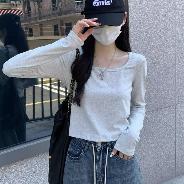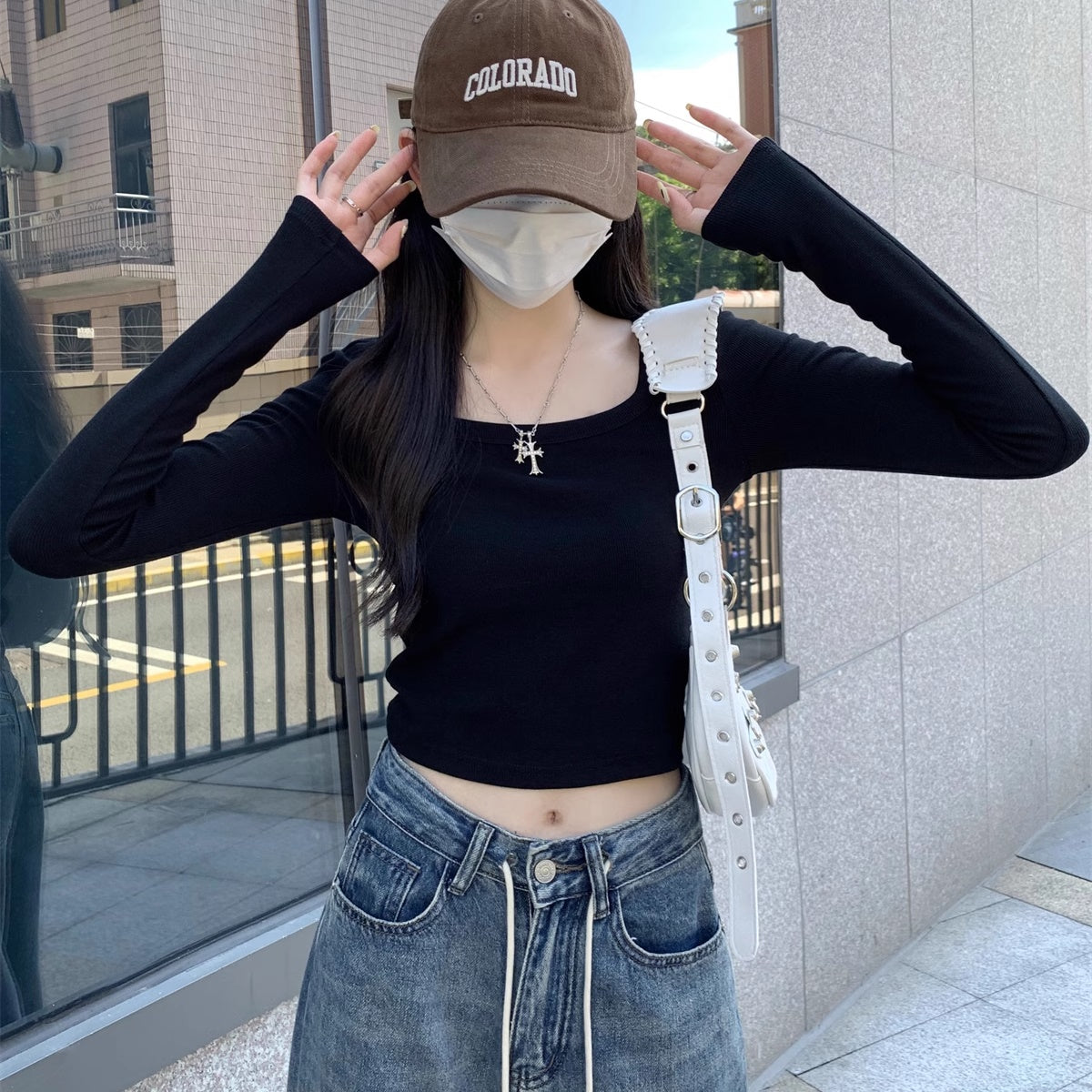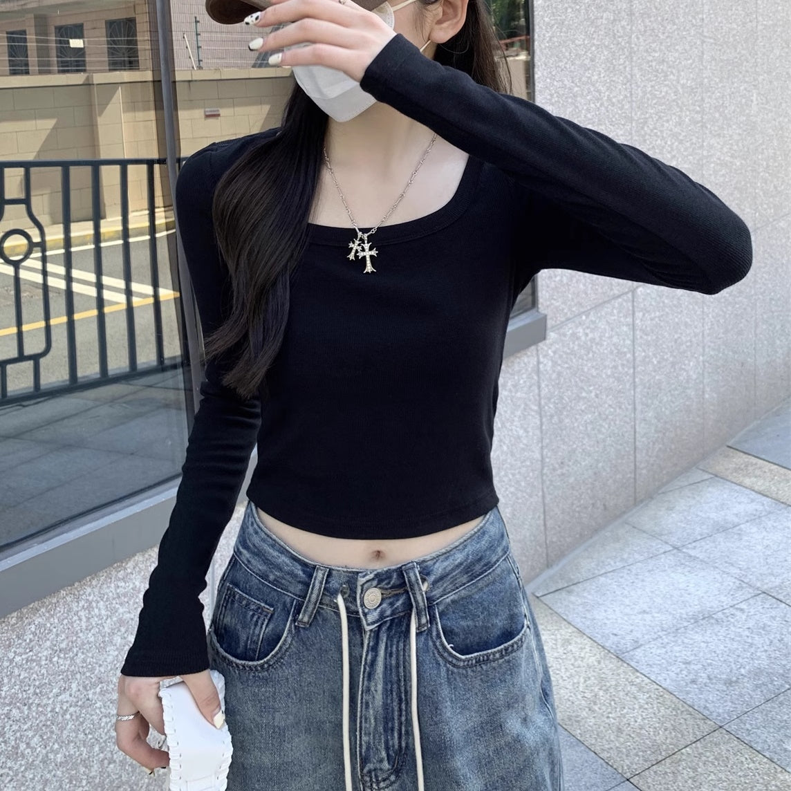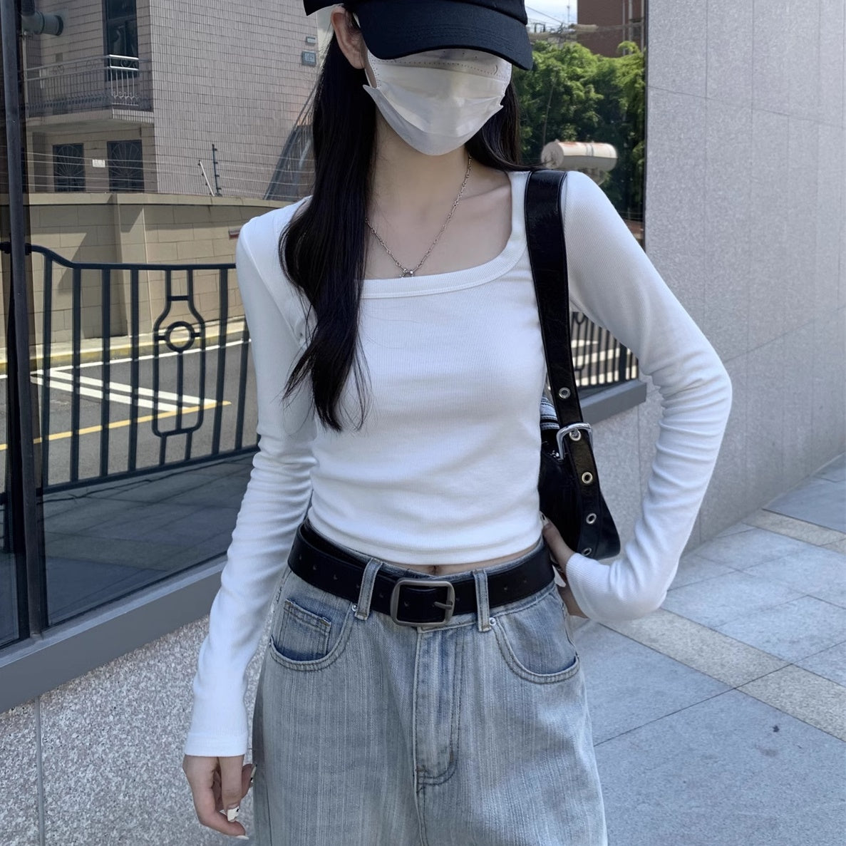 クロップドTシャツ カットソー レディース 韓国 ファッション スクエアネック デコルテ ロング袖 ストレッチタイト