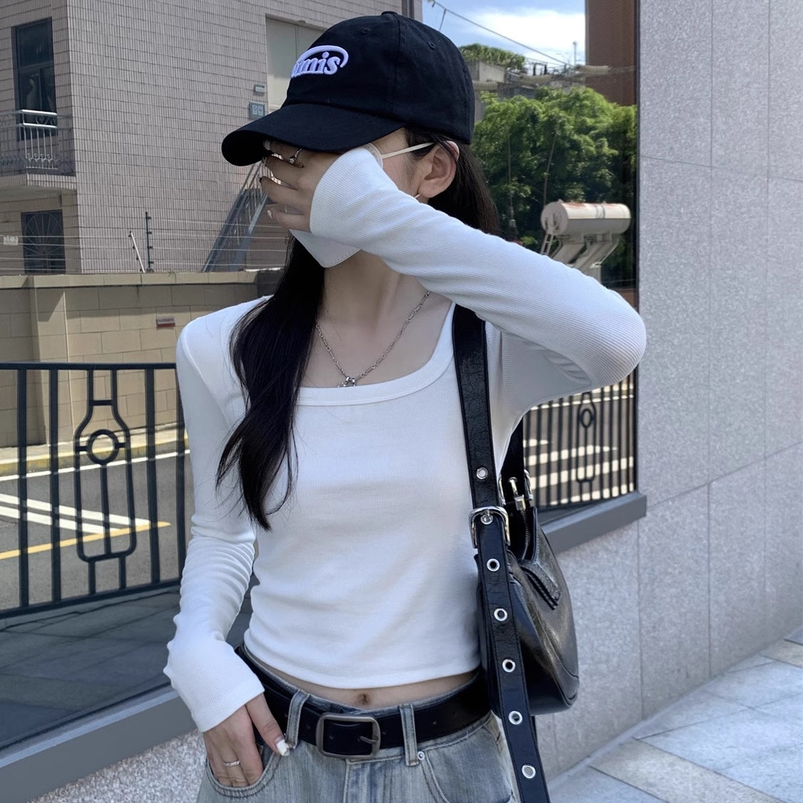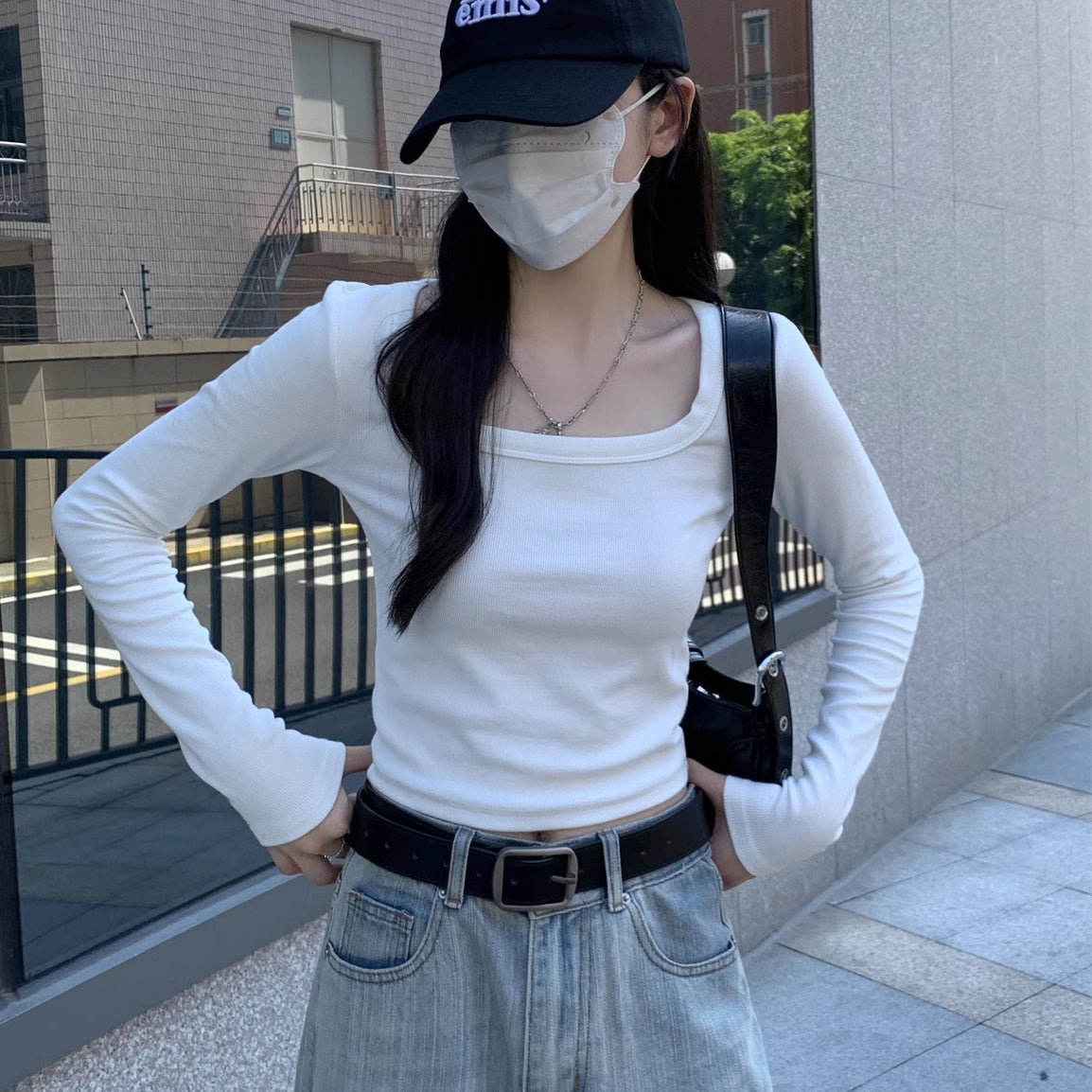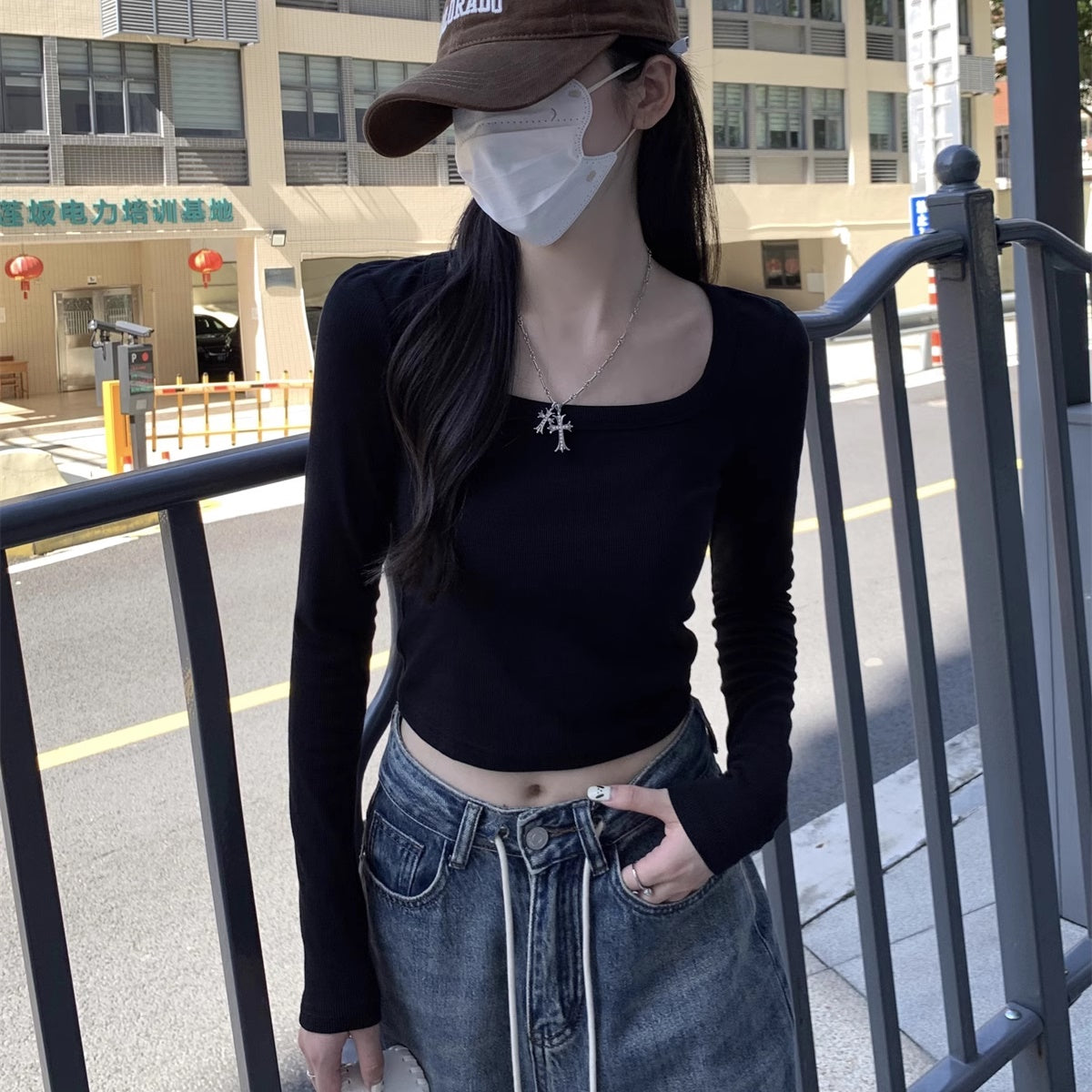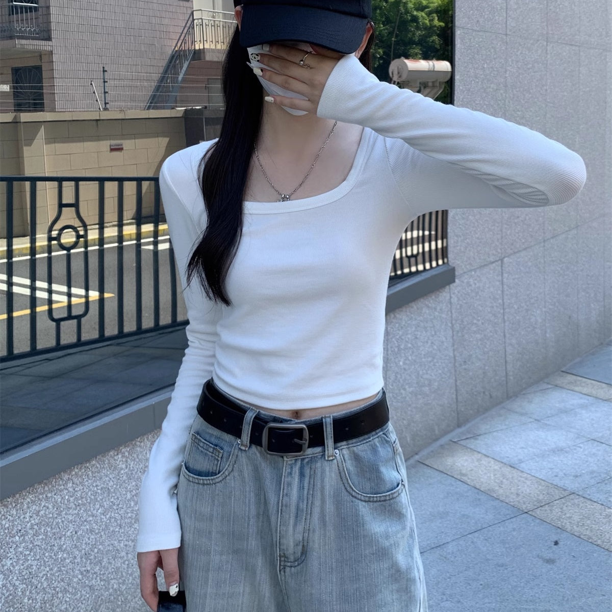 クロップドTシャツ カットソー レディース 韓国 ファッション スクエアネック デコルテ ロング袖 ストレッチタイト