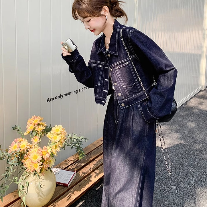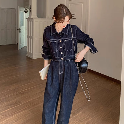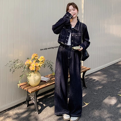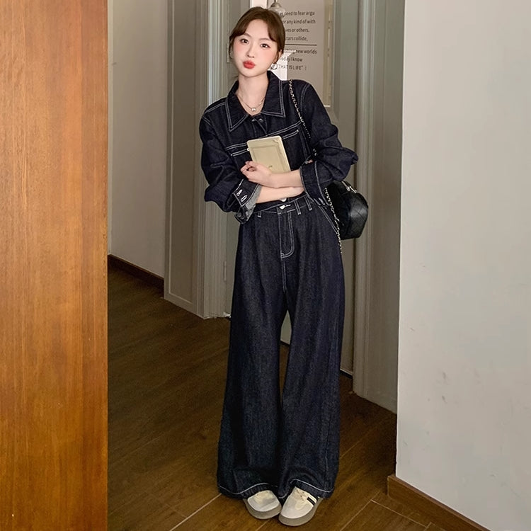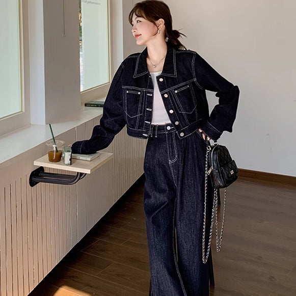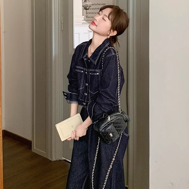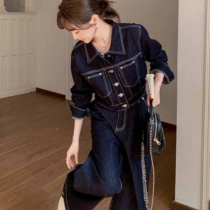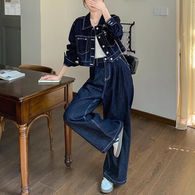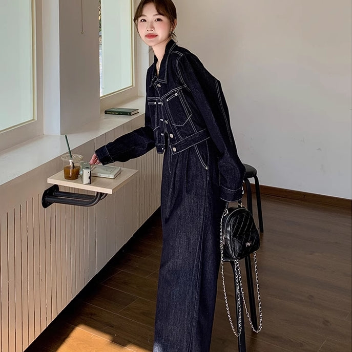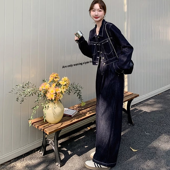 デニムセットアップ レディース 韓国 ファッション インディゴデニム 春 上下2点セット ワイドパンツ 薄手デニム クロップドデニムジャケット ロングパンツ