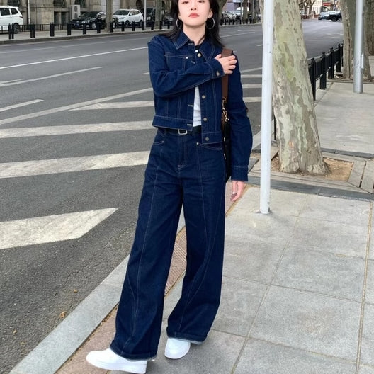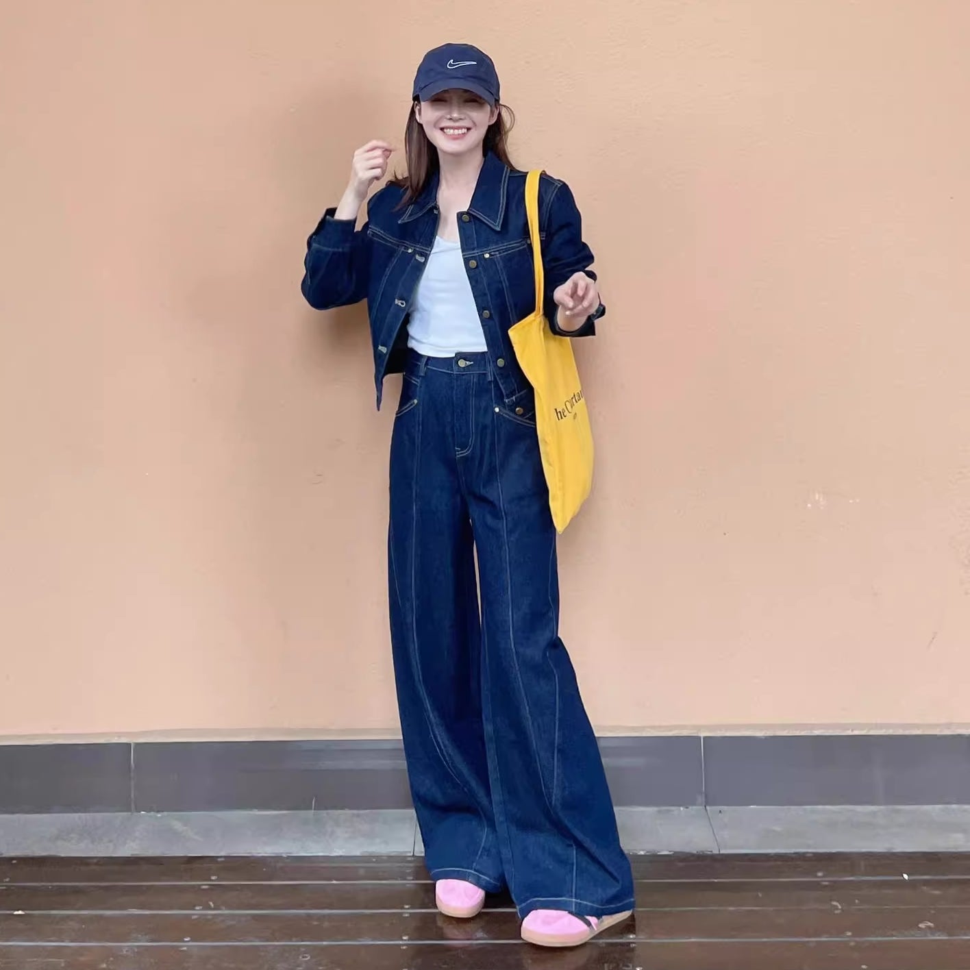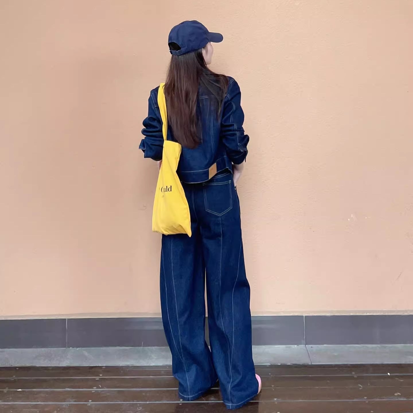 デニムセットアップ レディース 韓国 ファッション デニムジャケット デニムパンツ インディゴ ネイビー ワイドパンツ クロップドジャケット ネイビー ロングパンツ