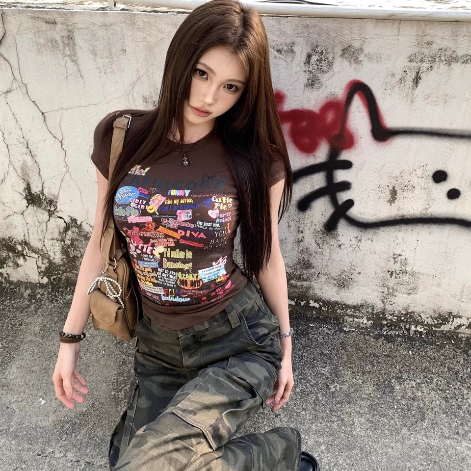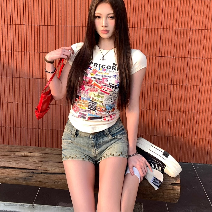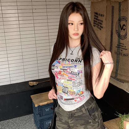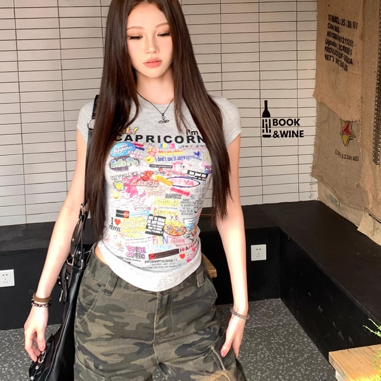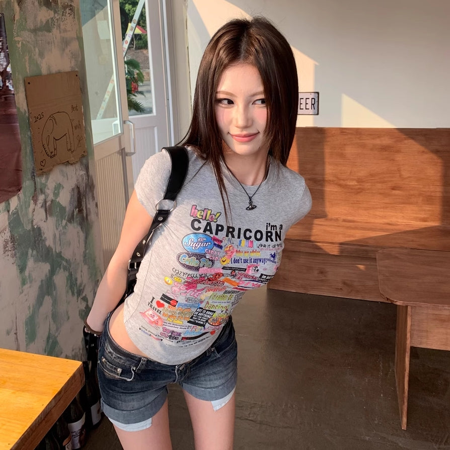 Tシャツ レディース 韓国 ファッション プリント ロゴ フレンチ袖 タイトT