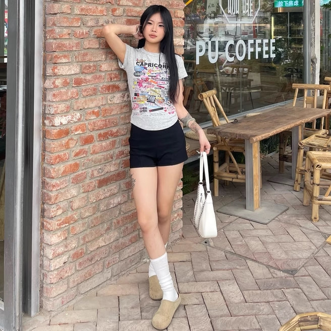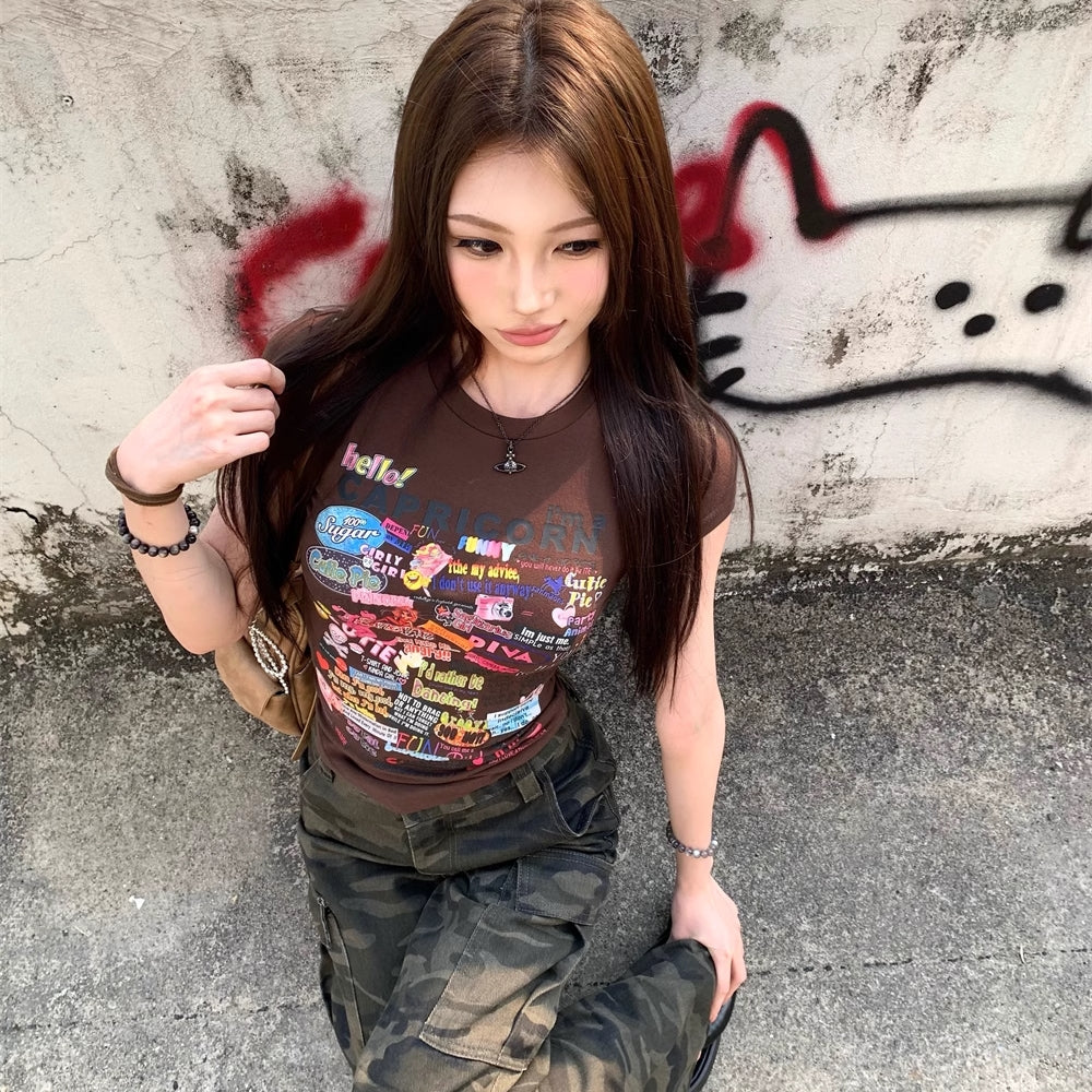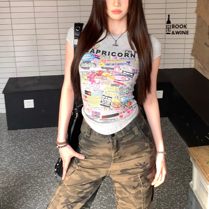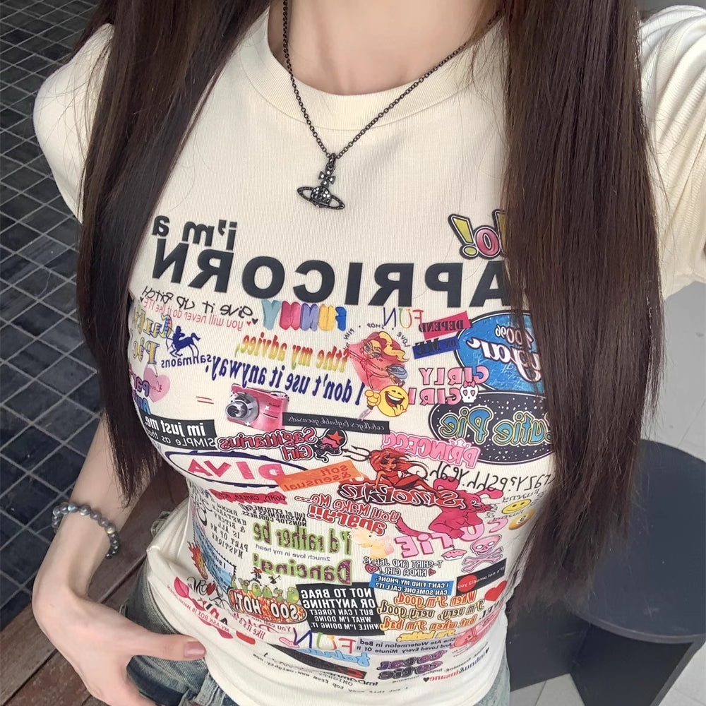 Tシャツ レディース 韓国 ファッション プリント ロゴ フレンチ袖 タイトT