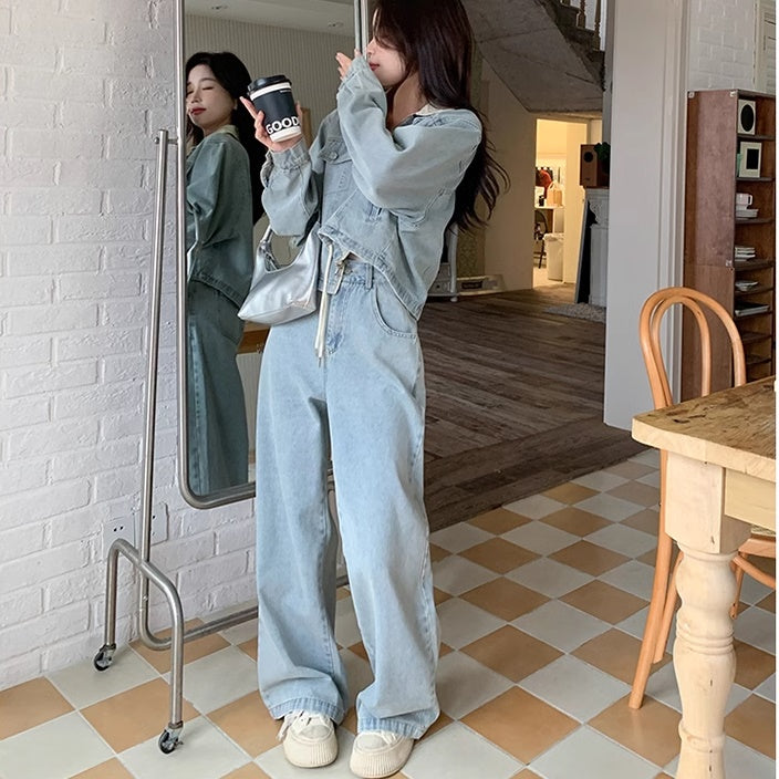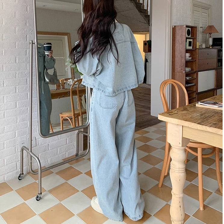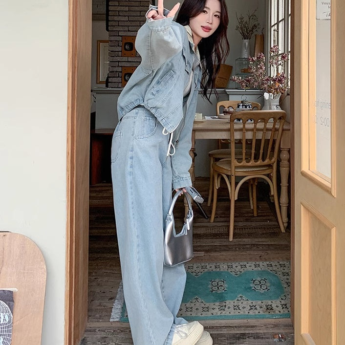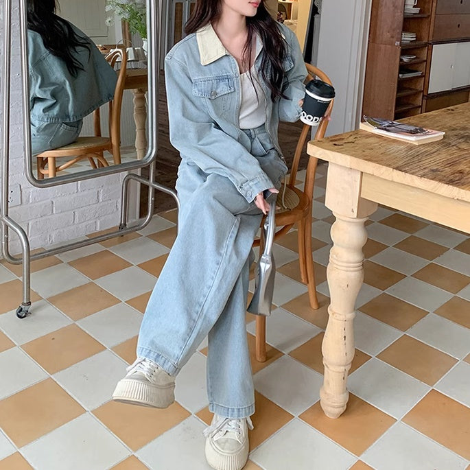デニム セットアップ レディース 韓国 ファッション デニムオンデニム 襟 ショート デニムブルゾン ワイドデニム 上下2点セット