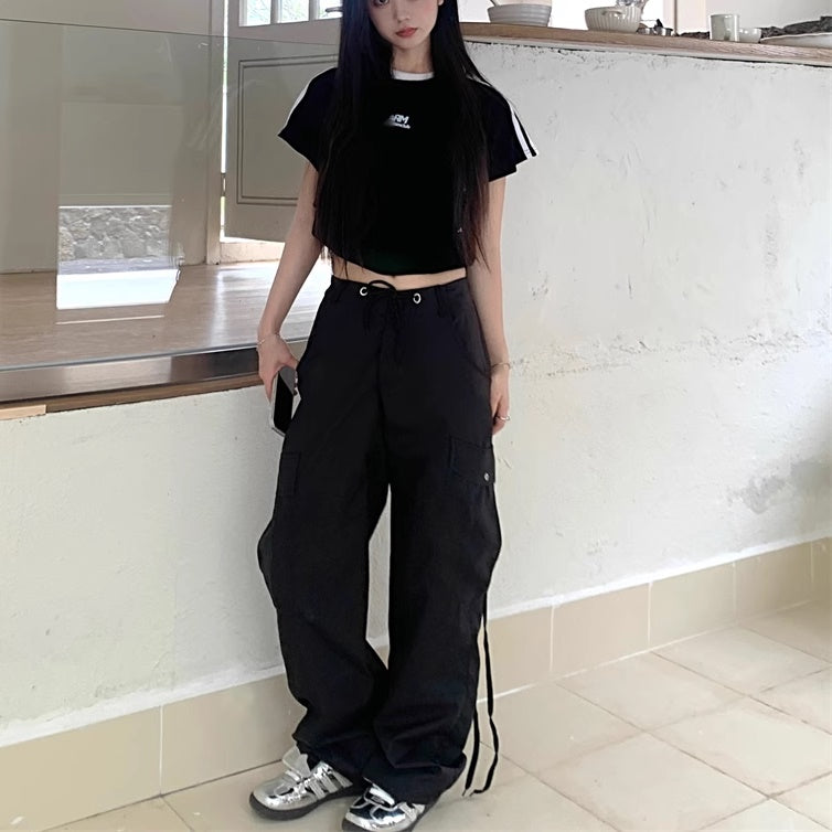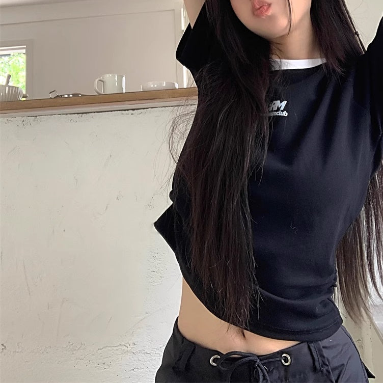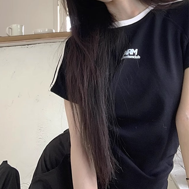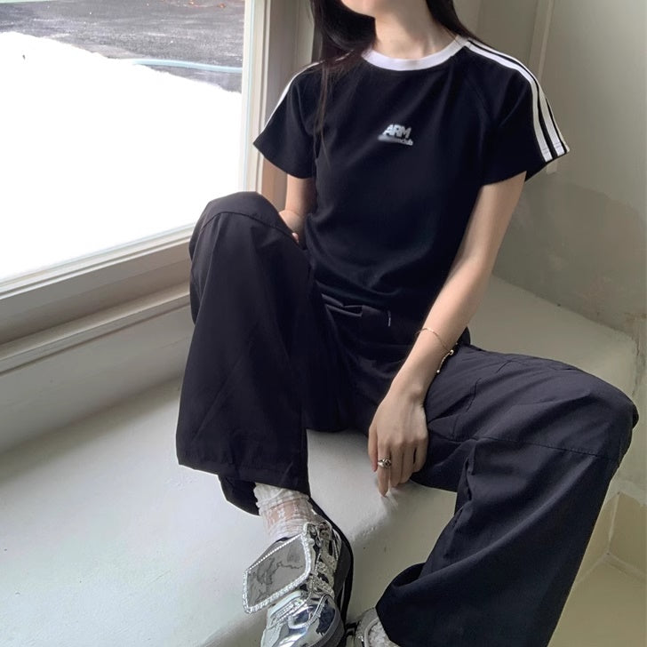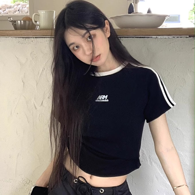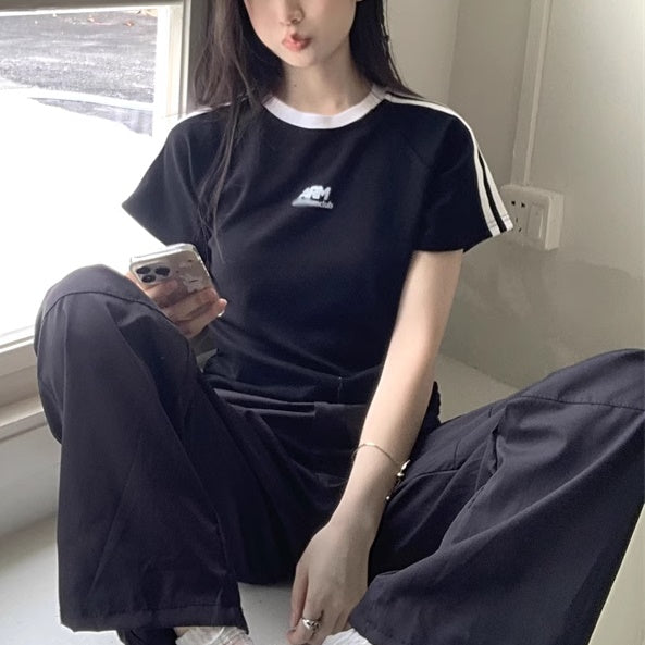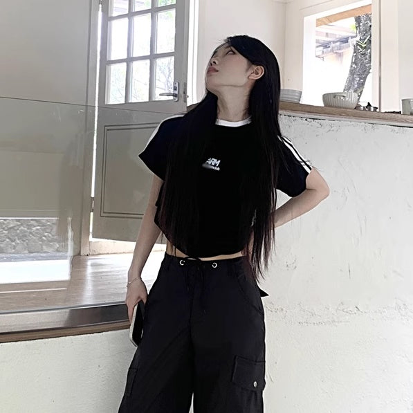 スポーティー ライン クロップド Tシャツ レディース 韓国 ファッション クロップド ロゴマーク リンガーT