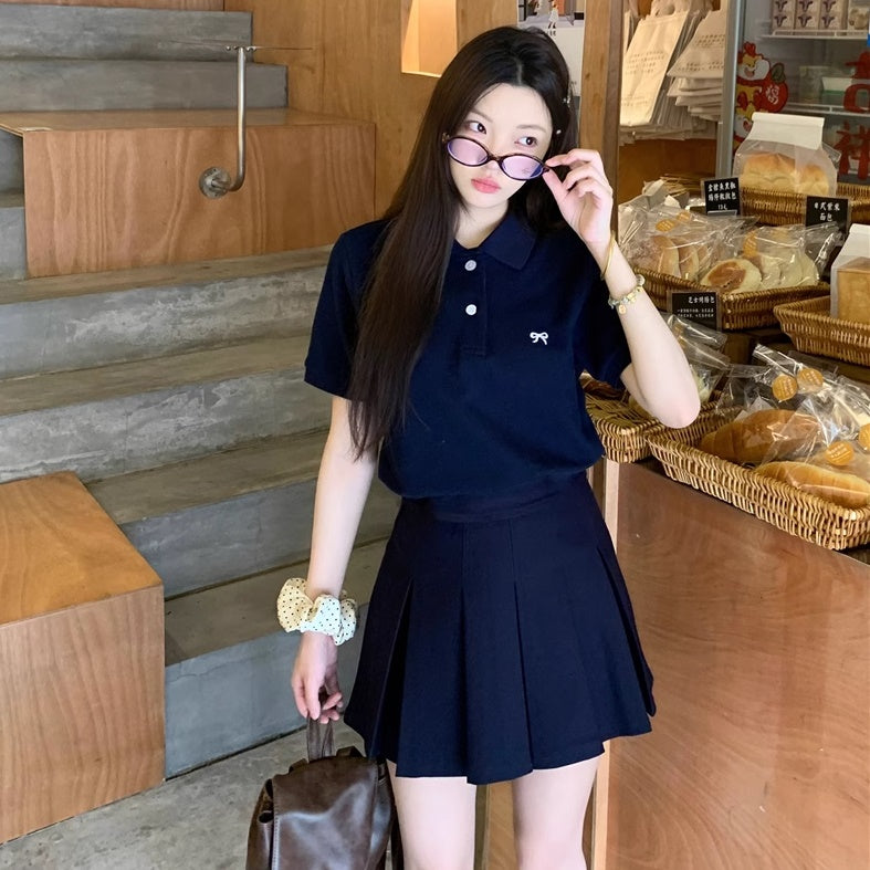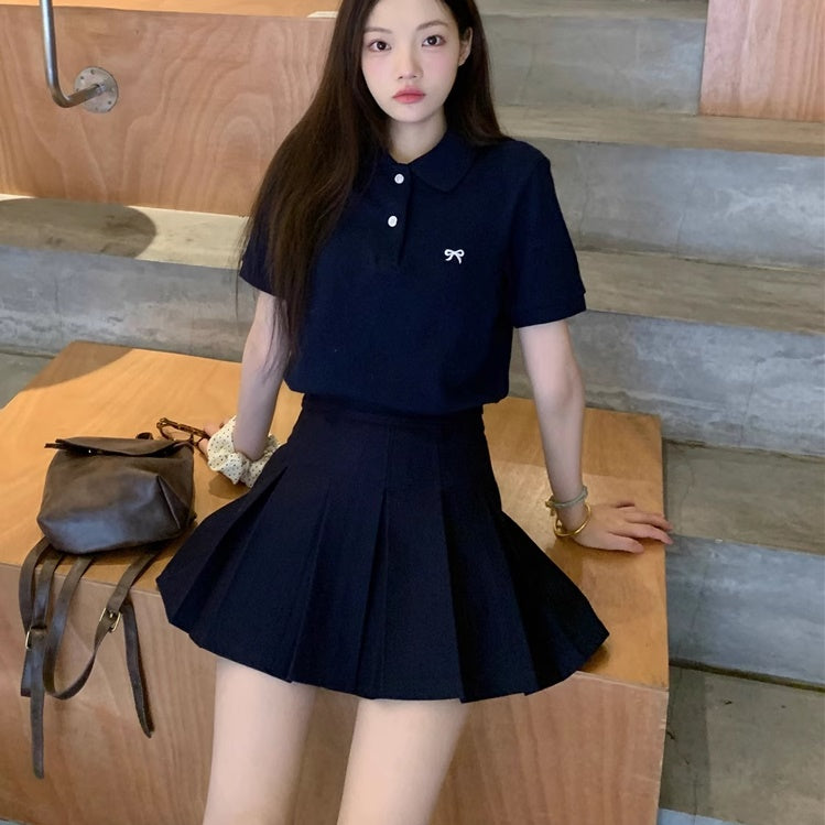 セットアップ レディース ポロシャツ ミニスカート 上下セット 韓国 ファッション リボン プリーツスカート カレッジコーデ
