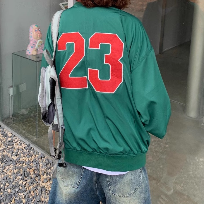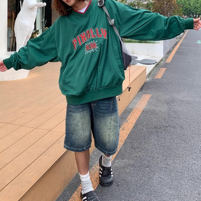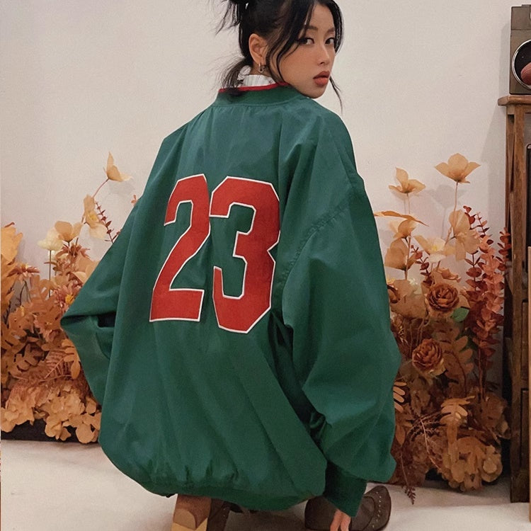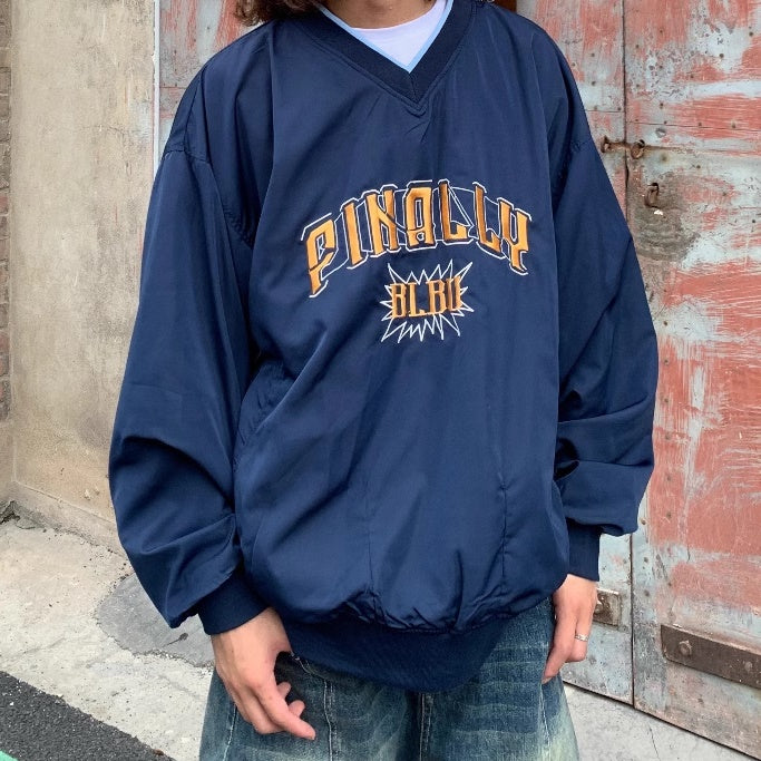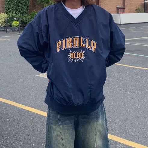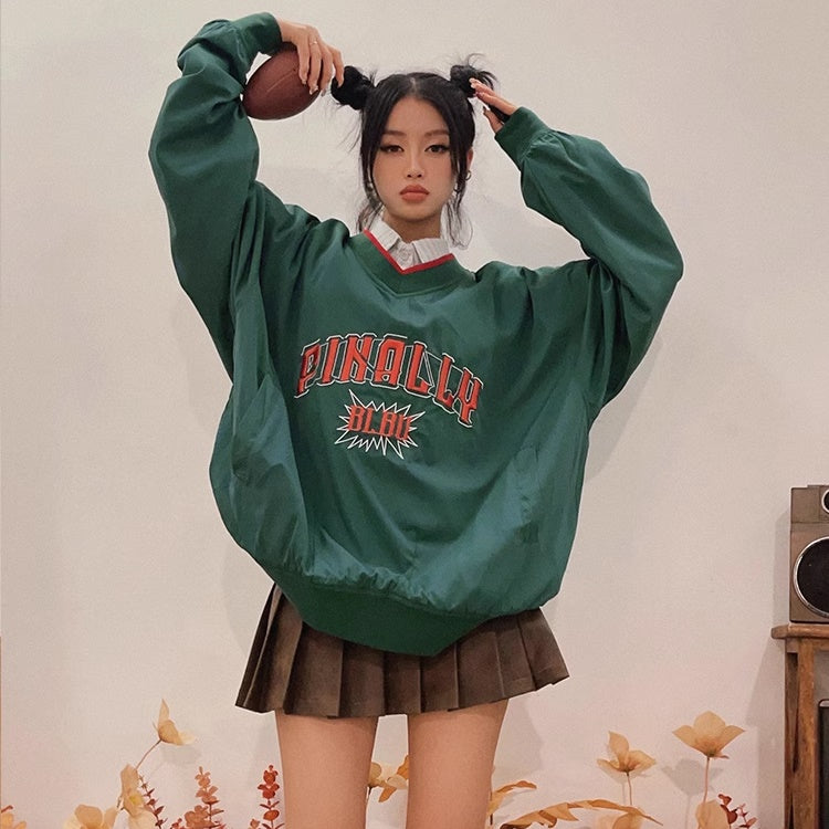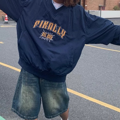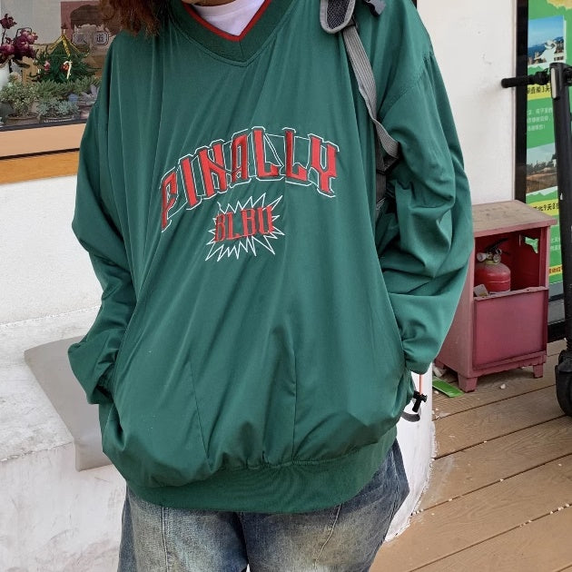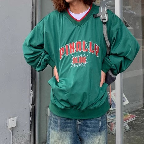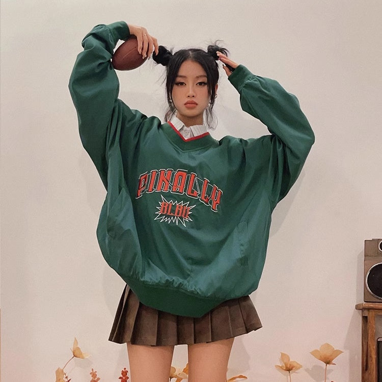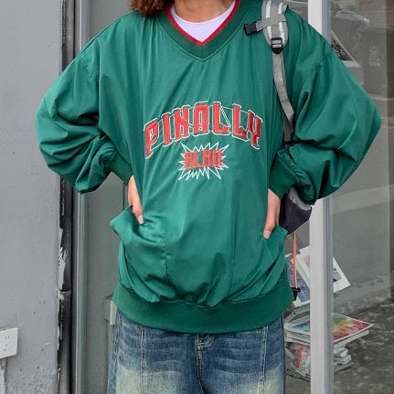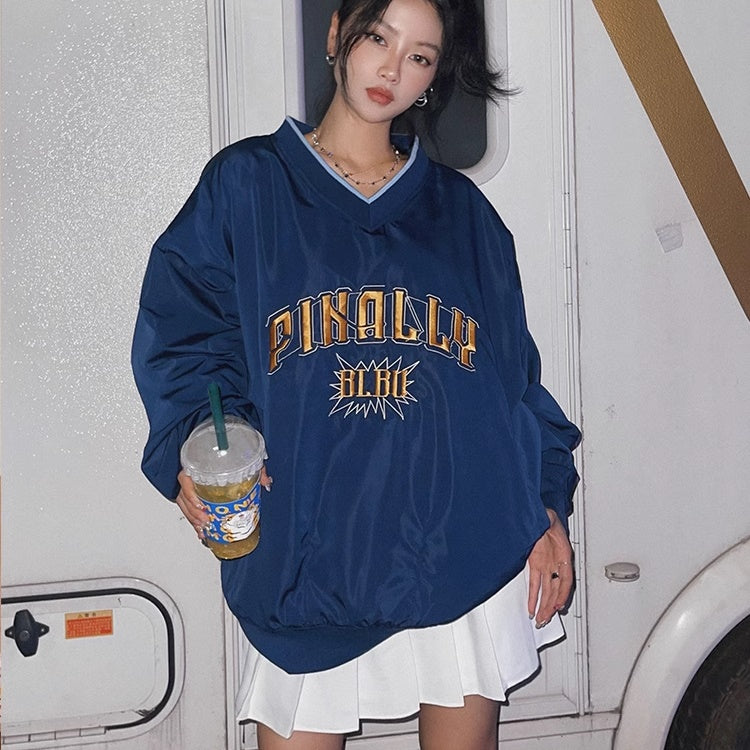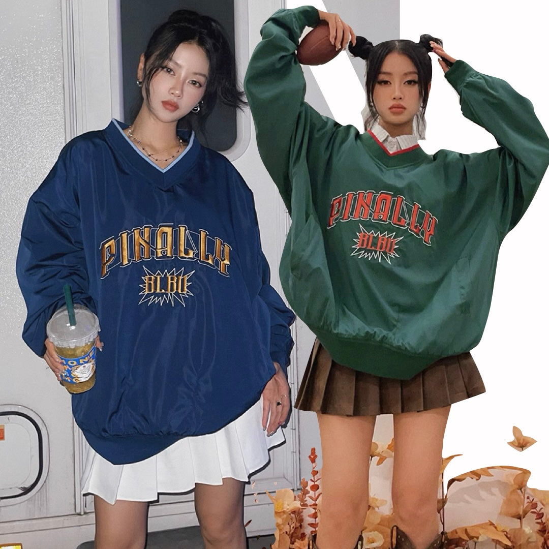 ゲームシャツ 韓国 ファッション レディース ナイロン トレーナー ナンバーロゴ バックプリント Vネック オーバーサイズ スポーティー ストリート