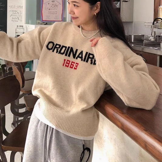 ニット トップス レディース 韓国 ファッション 秋冬 セーター 厚手 ハイゲージ ロゴ クルーネック