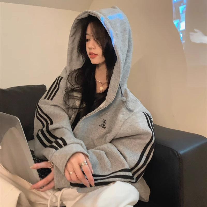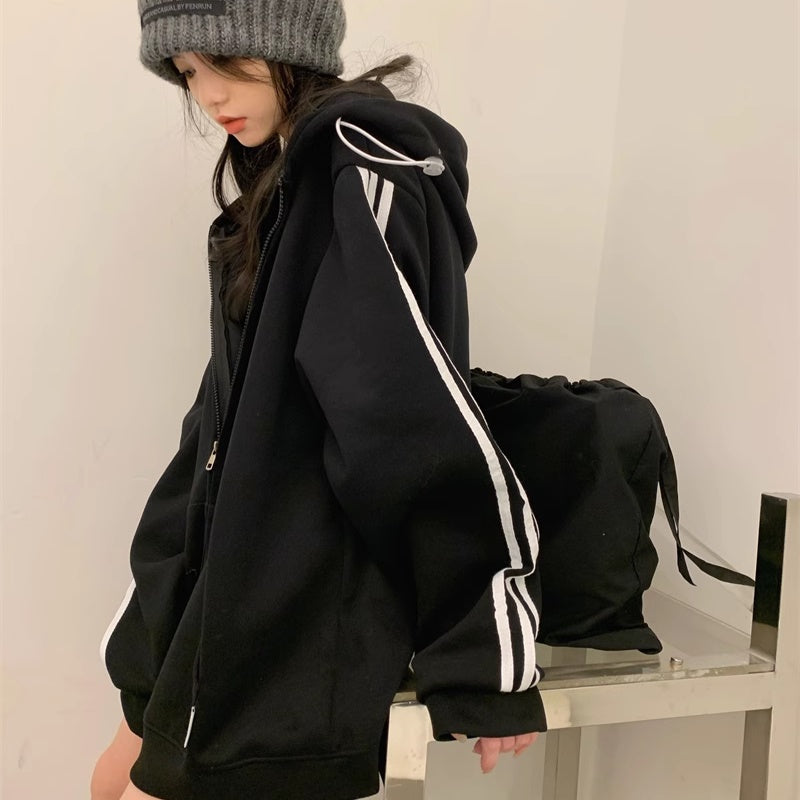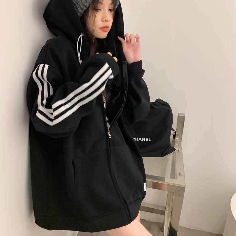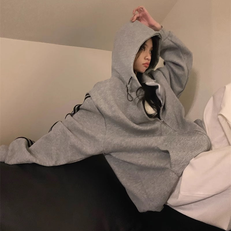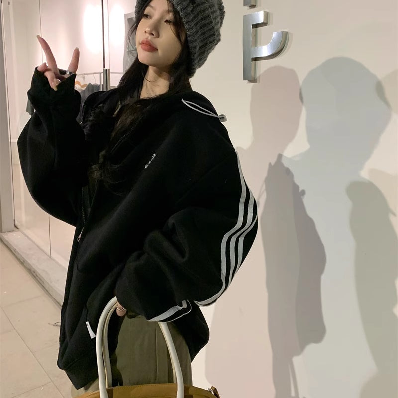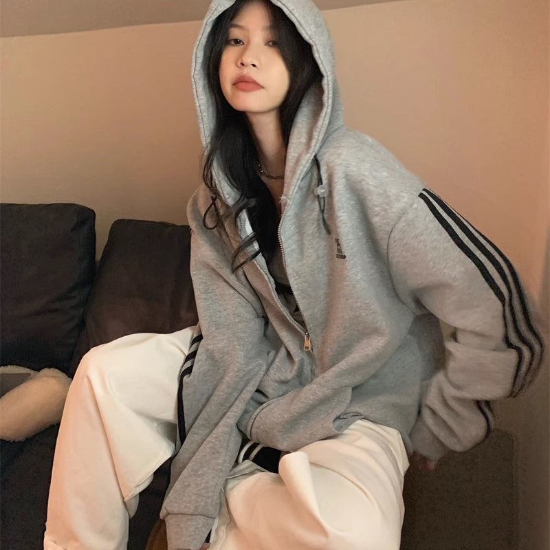 ライン パーカー レディース 韓国 ファッション ジップアップ オーバーサイズ スポーティ パーカー サイドライン ロゴ ワンポイント フーディー 秋冬 トップス