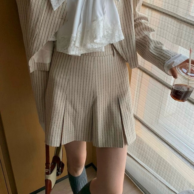 セットアップ 3点セット レディース 韓国 ファッション ボウタイシャツ ジャケット プリーツスカート ストライプ 春スーツ お呼ばれ 上品 かわいい スーツ 刺繍レース