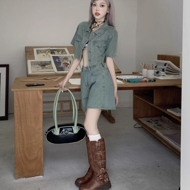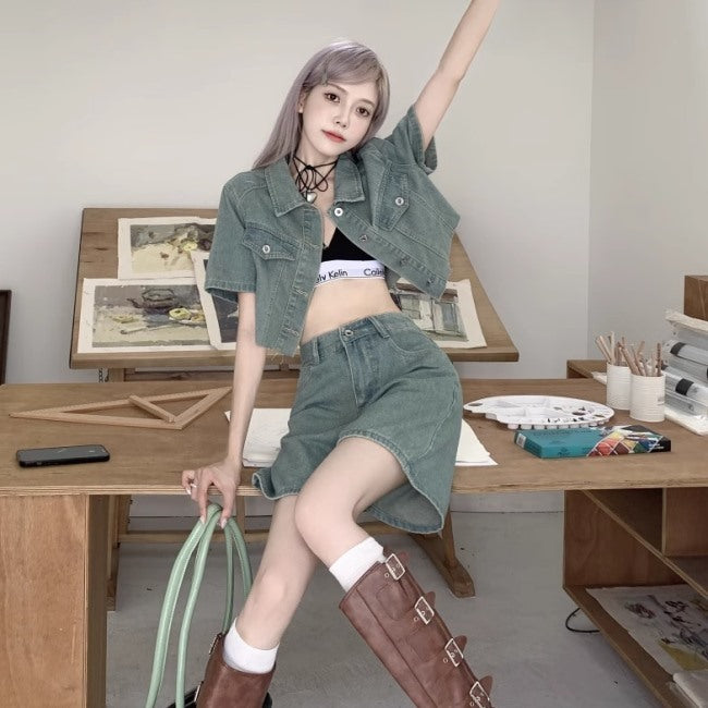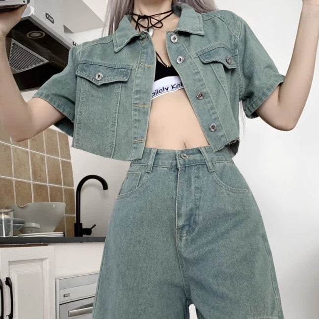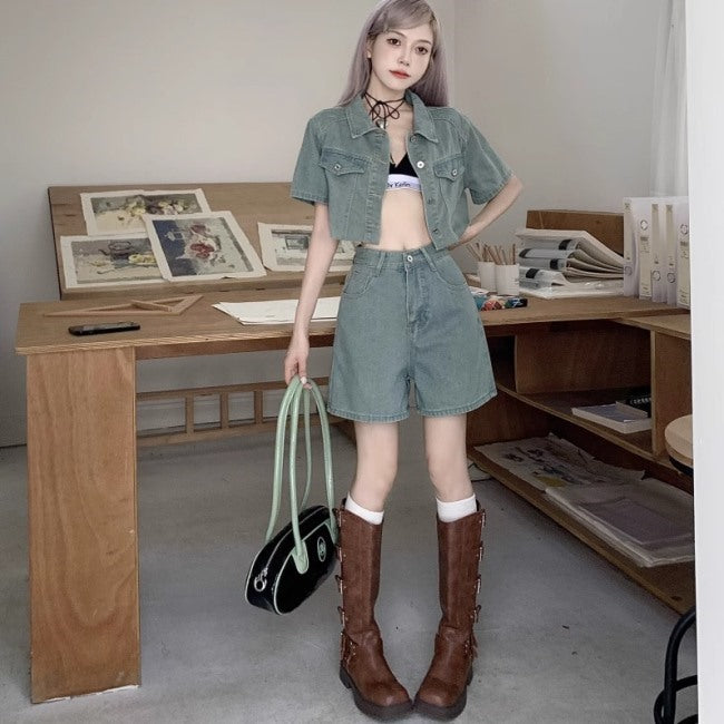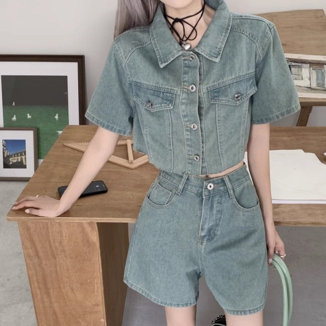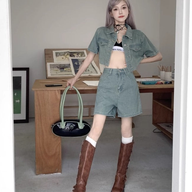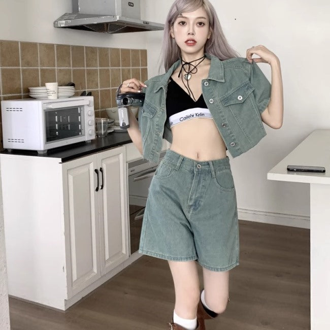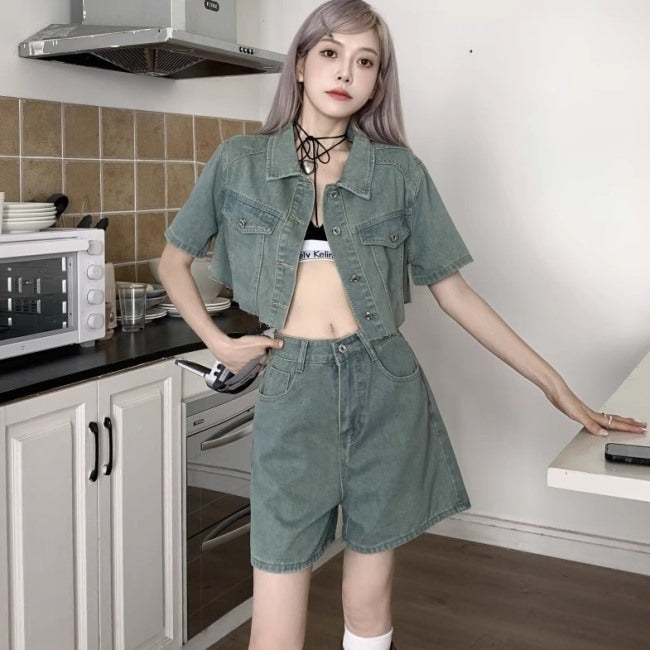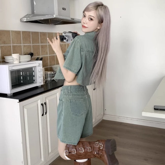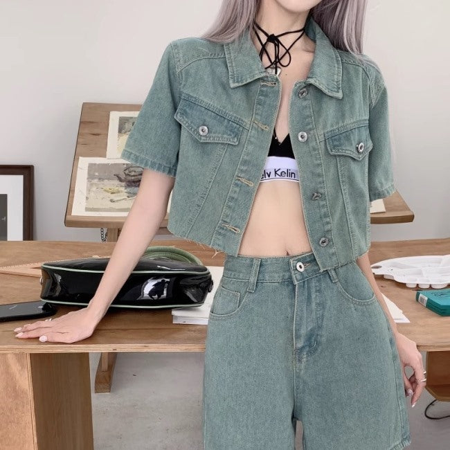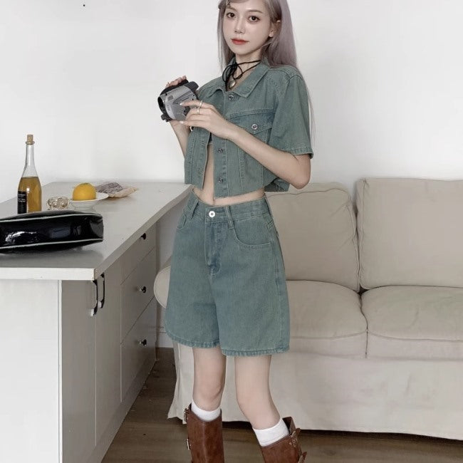 クロップデニム セットアップ レディース 韓国 ファッション ハーフパンツ ジャケット 夏 デニムシャツ ショートパンツ デニム 2点セット 上下 ショート丈