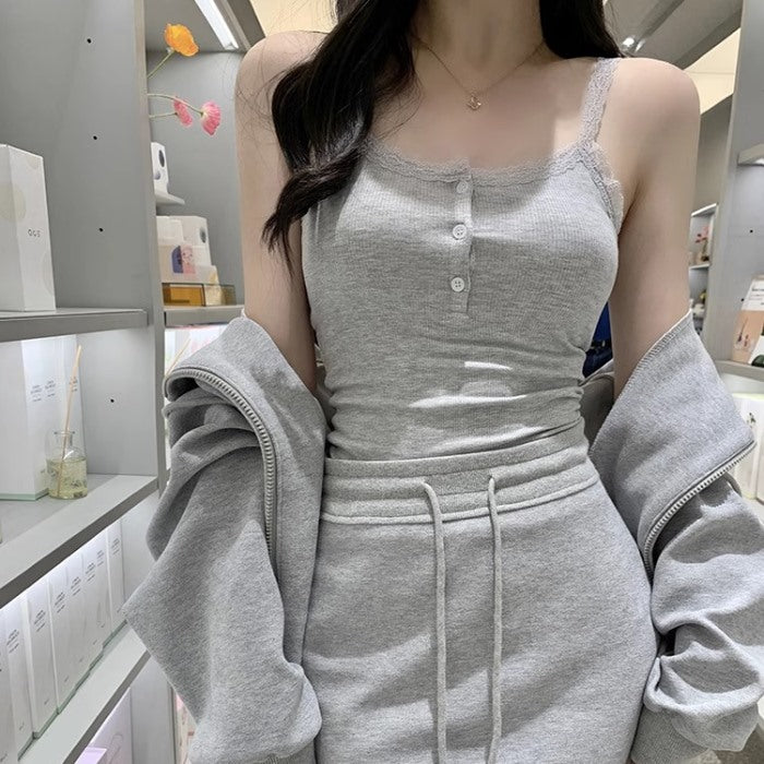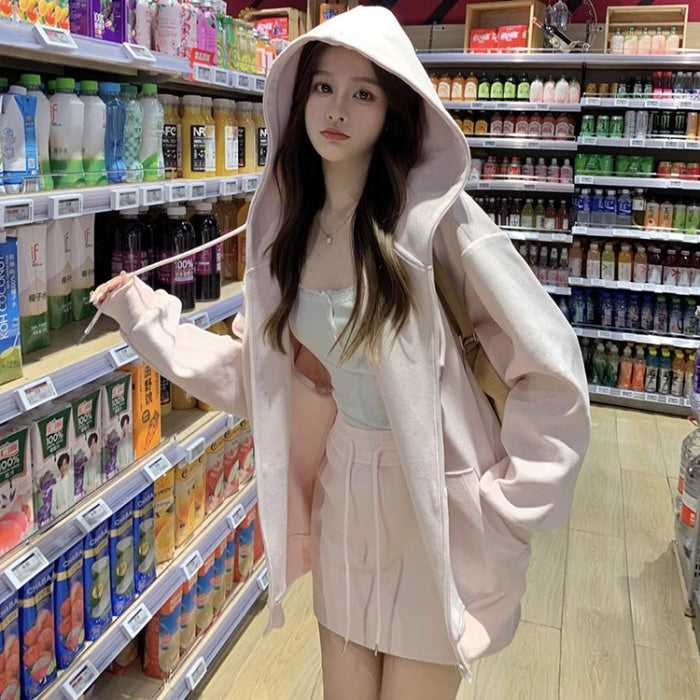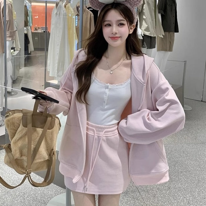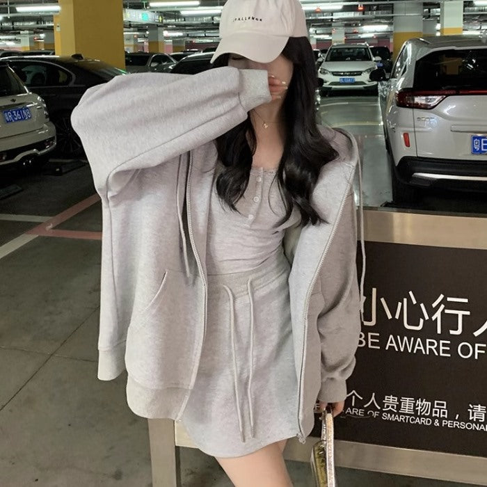 3点セット ジップパーカー レディース 韓国 ファッション ミニスカート キャミソール ビッグパーカー タイトスカート 秋冬コーデ セットアップ スウェットパーカー スカート