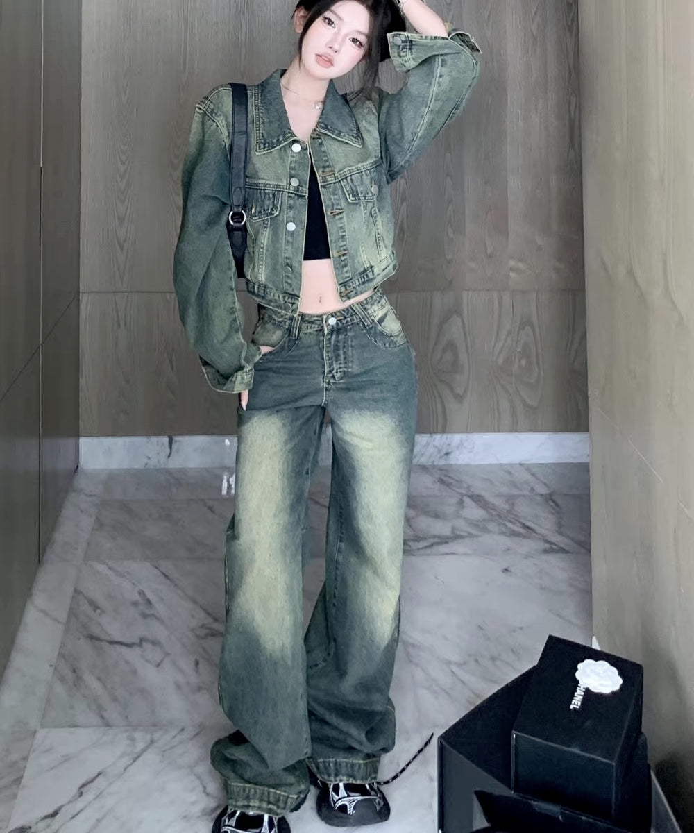 デニムセットアップ レディース 韓国 ファッション ビンテージデニム ダメージ加工 マニッシュ デニムセットアップ パンツ ジャケット