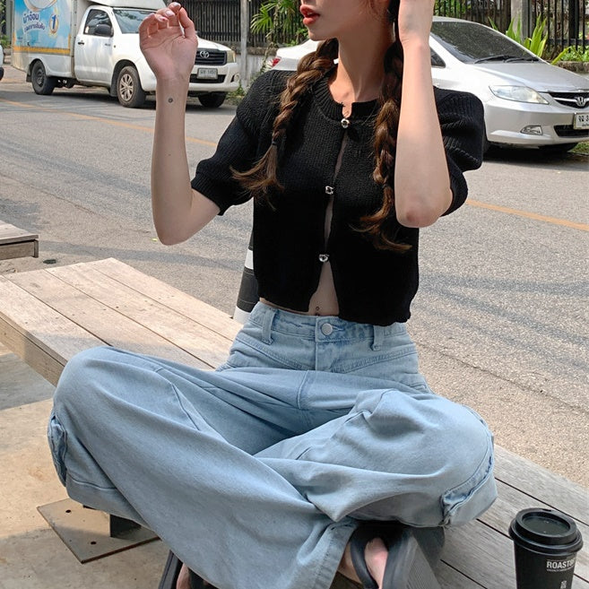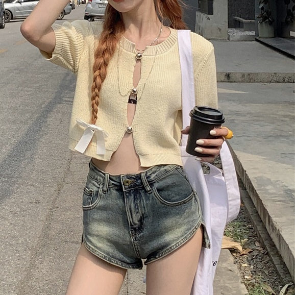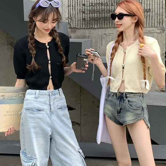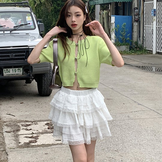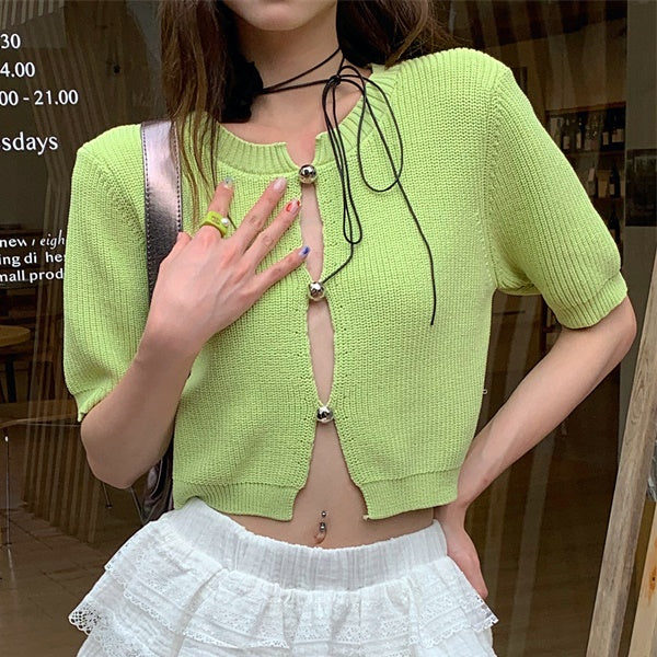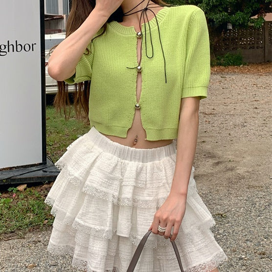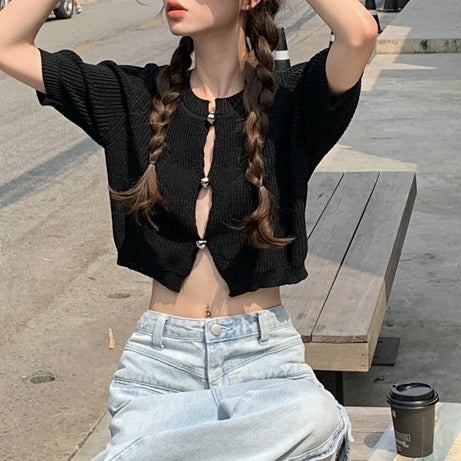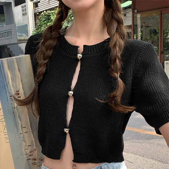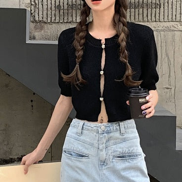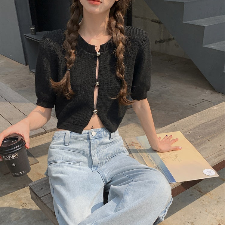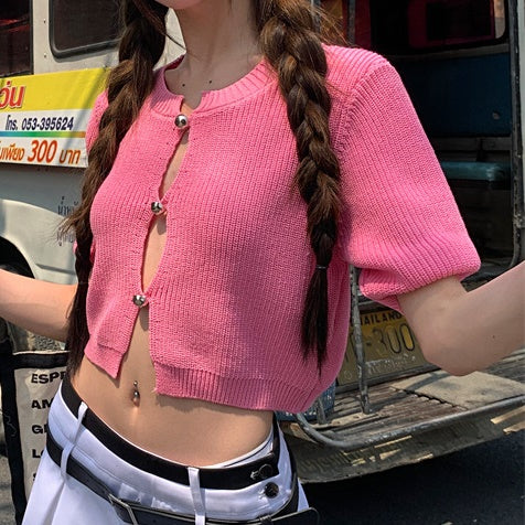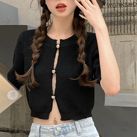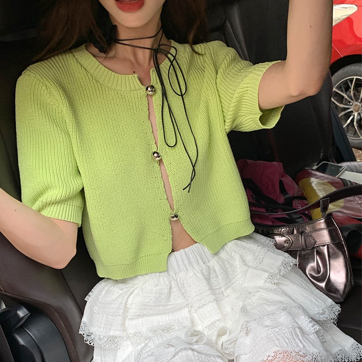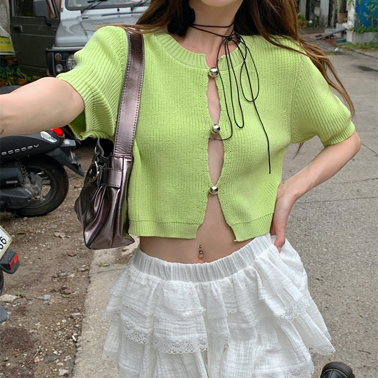 クロップド サマーニット カーディガン トップス レディース 韓国 ボタンホック ショート丈 夏服 半袖 ニットトップス