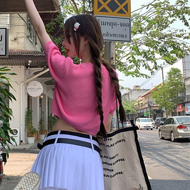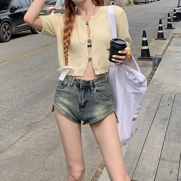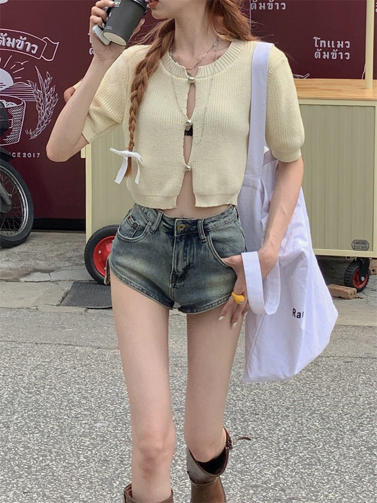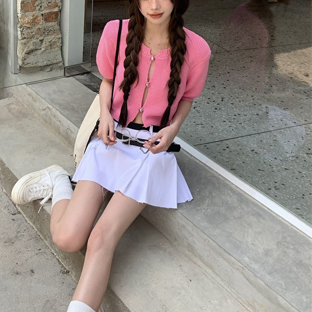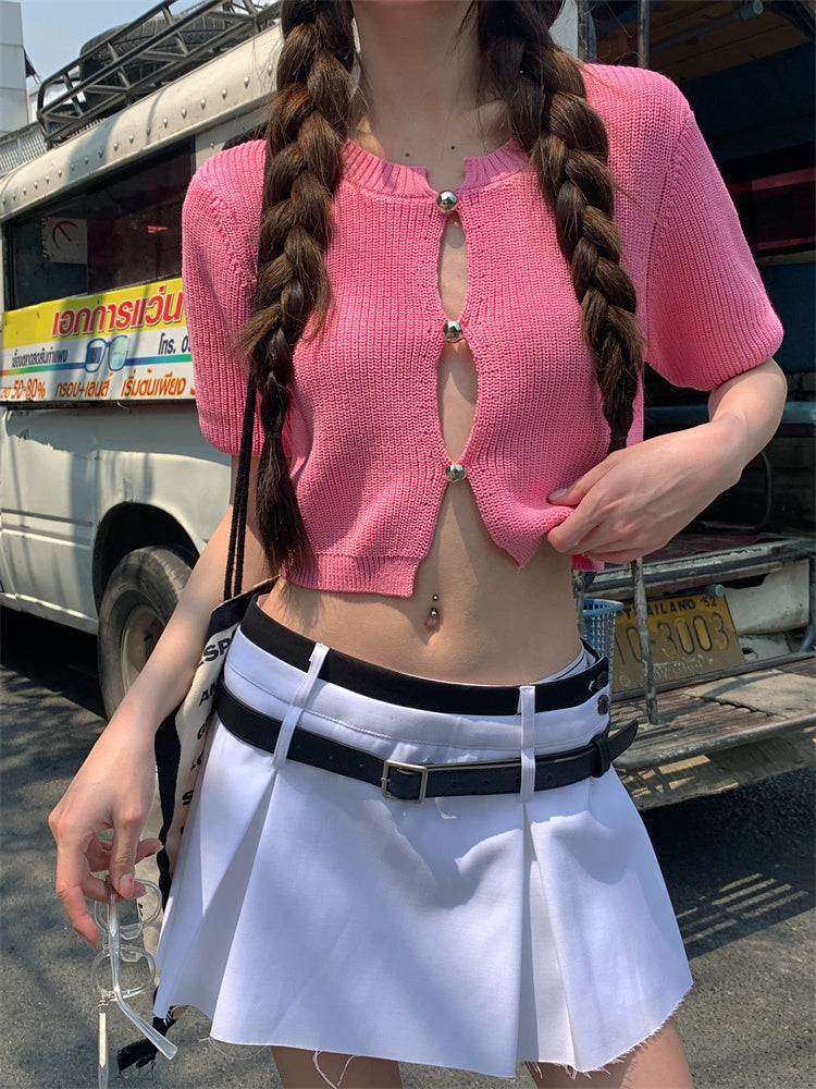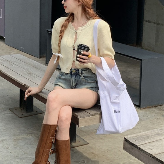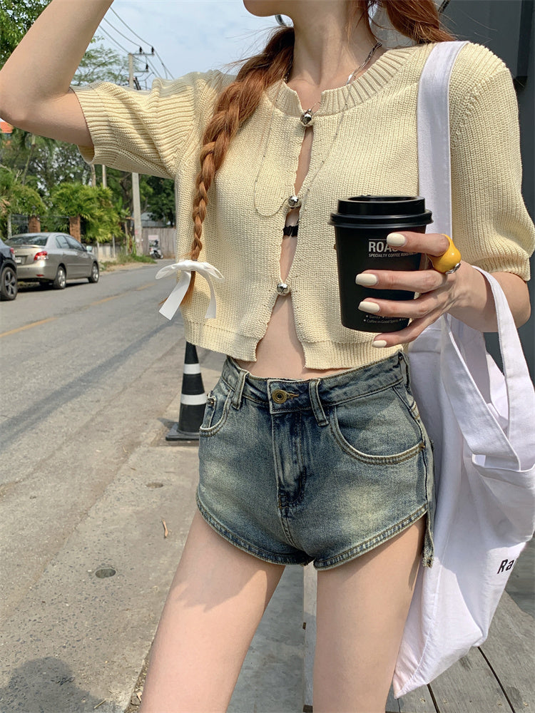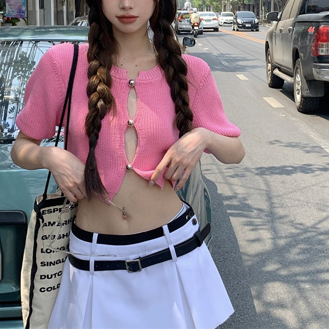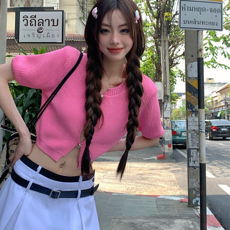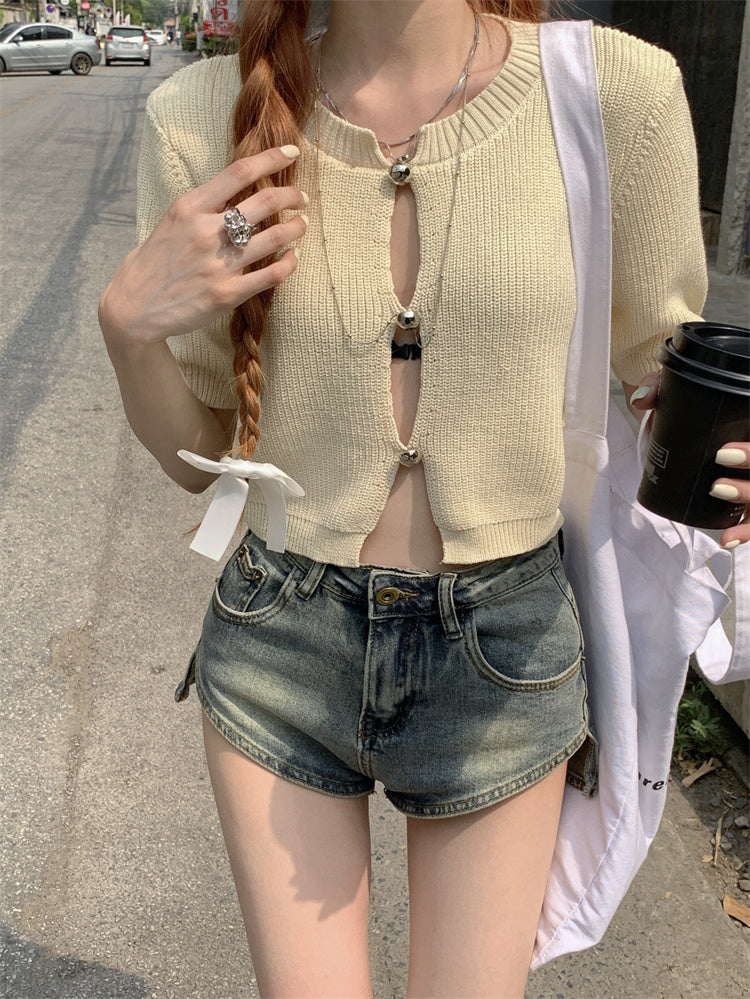 クロップド サマーニット カーディガン トップス レディース 韓国 ボタンホック ショート丈 夏服 半袖 ニットトップス