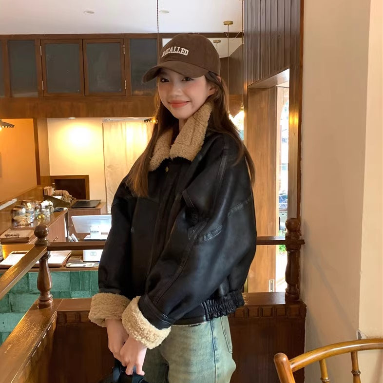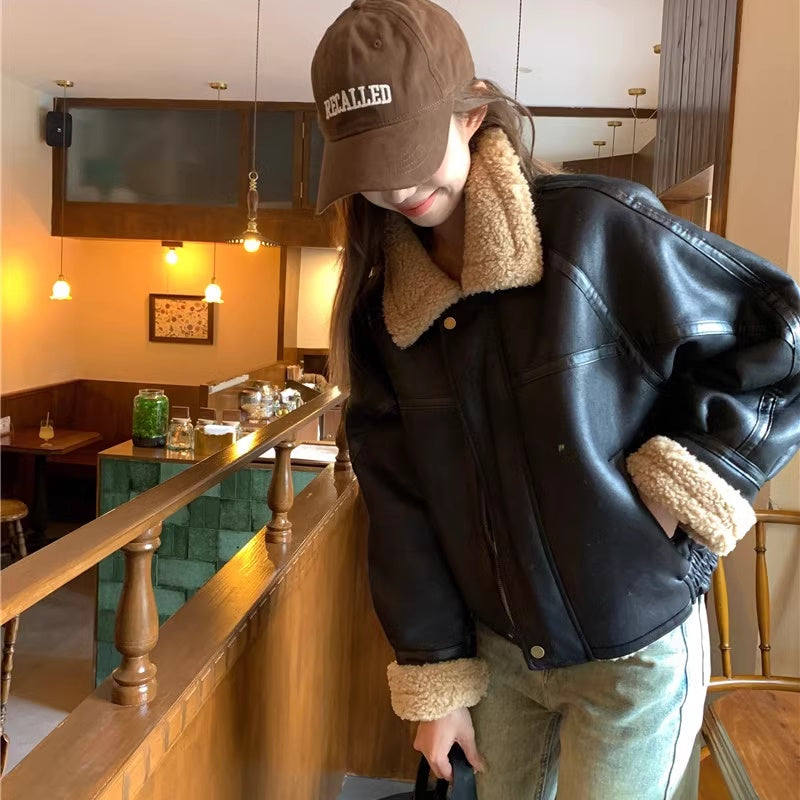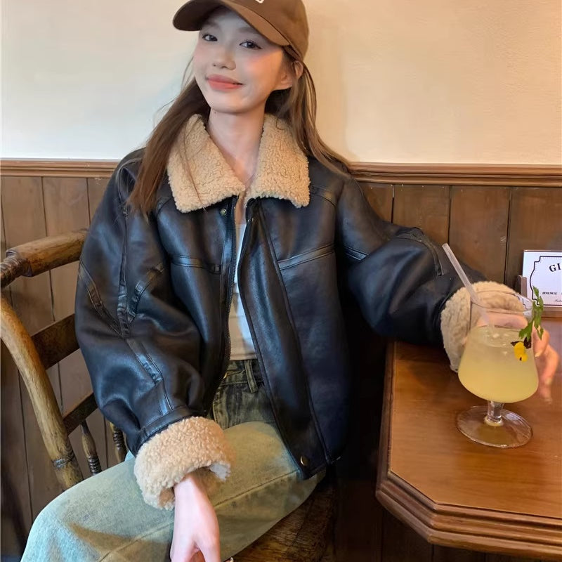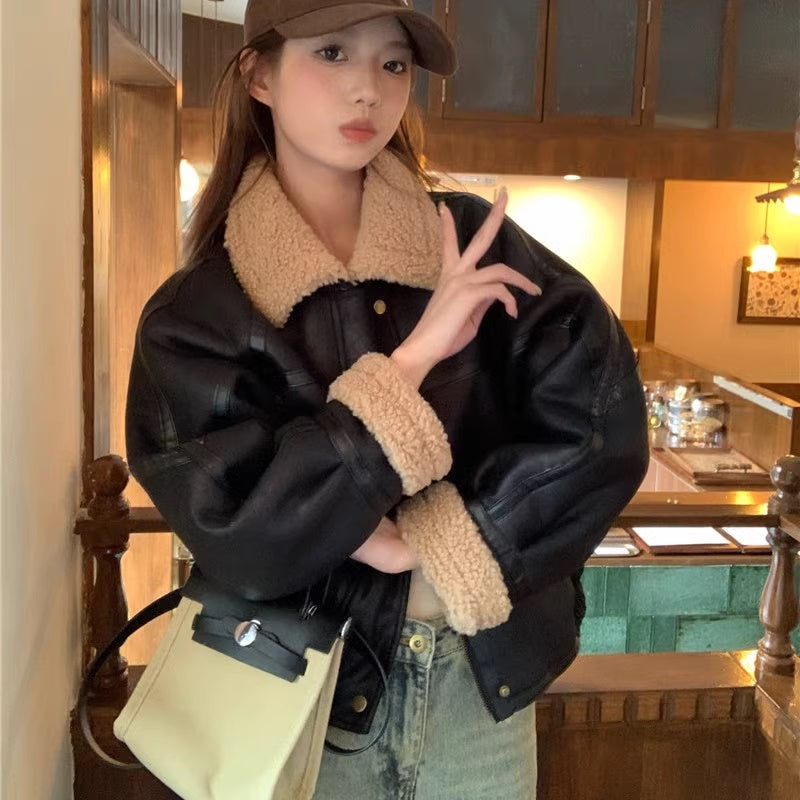 フェイクムートンジャケット レディース 韓国 ファッション フェイクレザー ライダース ボア襟 ボア袖 異素材ミックス 防寒 冬アウター 黒